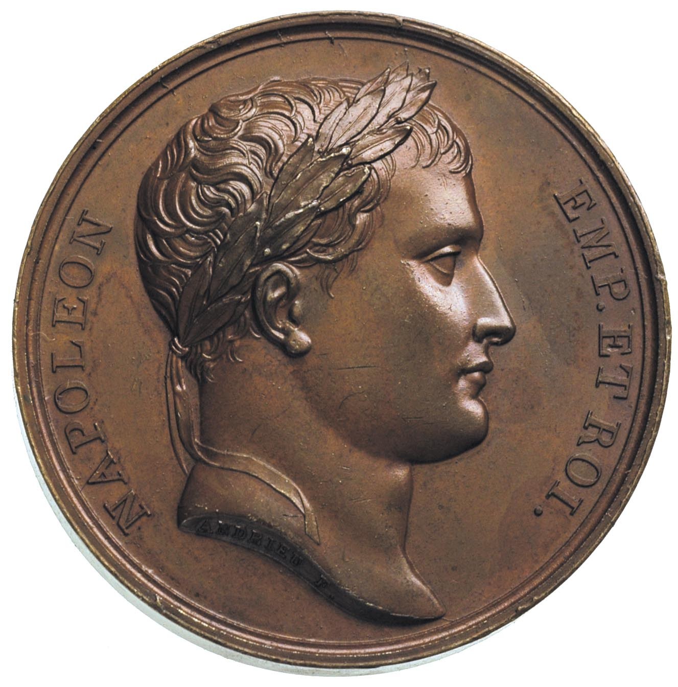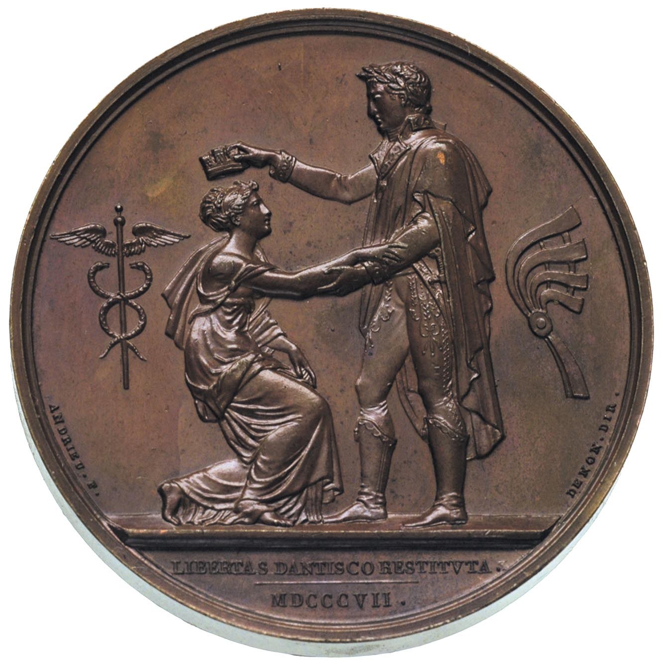 FRANCJA, Napoleon Bonaparte - medal autorstwa Andrieu’a i Denon’a wybity z okazji zdobycia Gdańska przez wojska Napoleona w 1807 r. i ustanowienia Wolnego Miasta, Aw: Popiersie Napoleona i napis, Rw: Napoleon koronujacy kleczącą przed nim kobietę, po bokach kaduceusz i kokarda, w odcinku napis LIBERTAS DANTISCO RESTITVTA MDCCCVII, brąz 38.71 g, 40 mm, H-Cz 4295, piękny egzemplarz