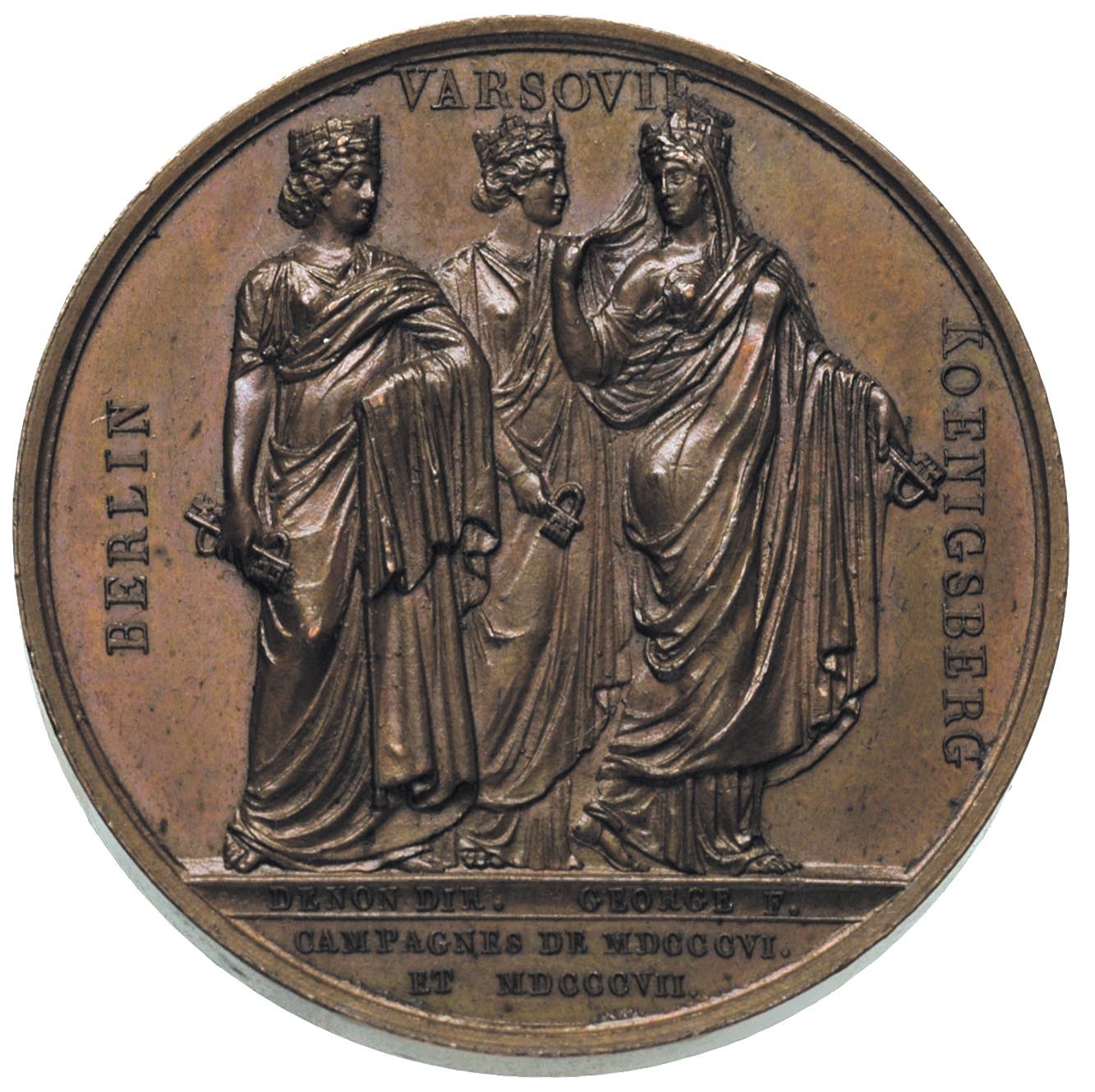 FRANCJA, Napoleon Bonaparte - medal autorstwa Denon’a i George’a upamiętniający kampanię w latach 1806-1807 - Berlin, Warszawa i Królewiec, Aw: Popiersie w prawo i napis, Rw: Trzy ukoronowane kobiety w strojach antycznch, po bokach napis BERLIN - VARSOVIE - KOENIGSBERG, w odcinku CAMPAGNES DE MDCCCVI ET MDCCCVII, brąz 37.82 g, 40 mm, H-Cz. 4794