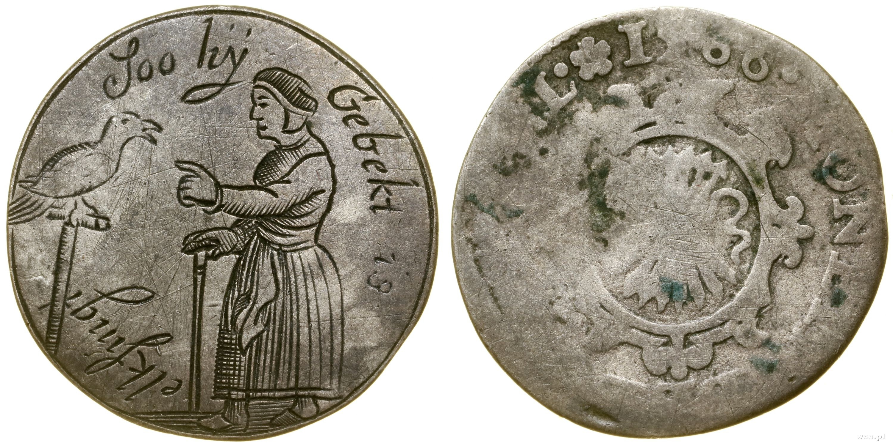 Aw: Kobieta wsparta na lasce, w lewo, wskazująca na papugę stojącą na belce, Ioo hy - Gebekt iz - elkfingt, Rw: Kartusz ze strzałami, MONE…BEL…EL 1586