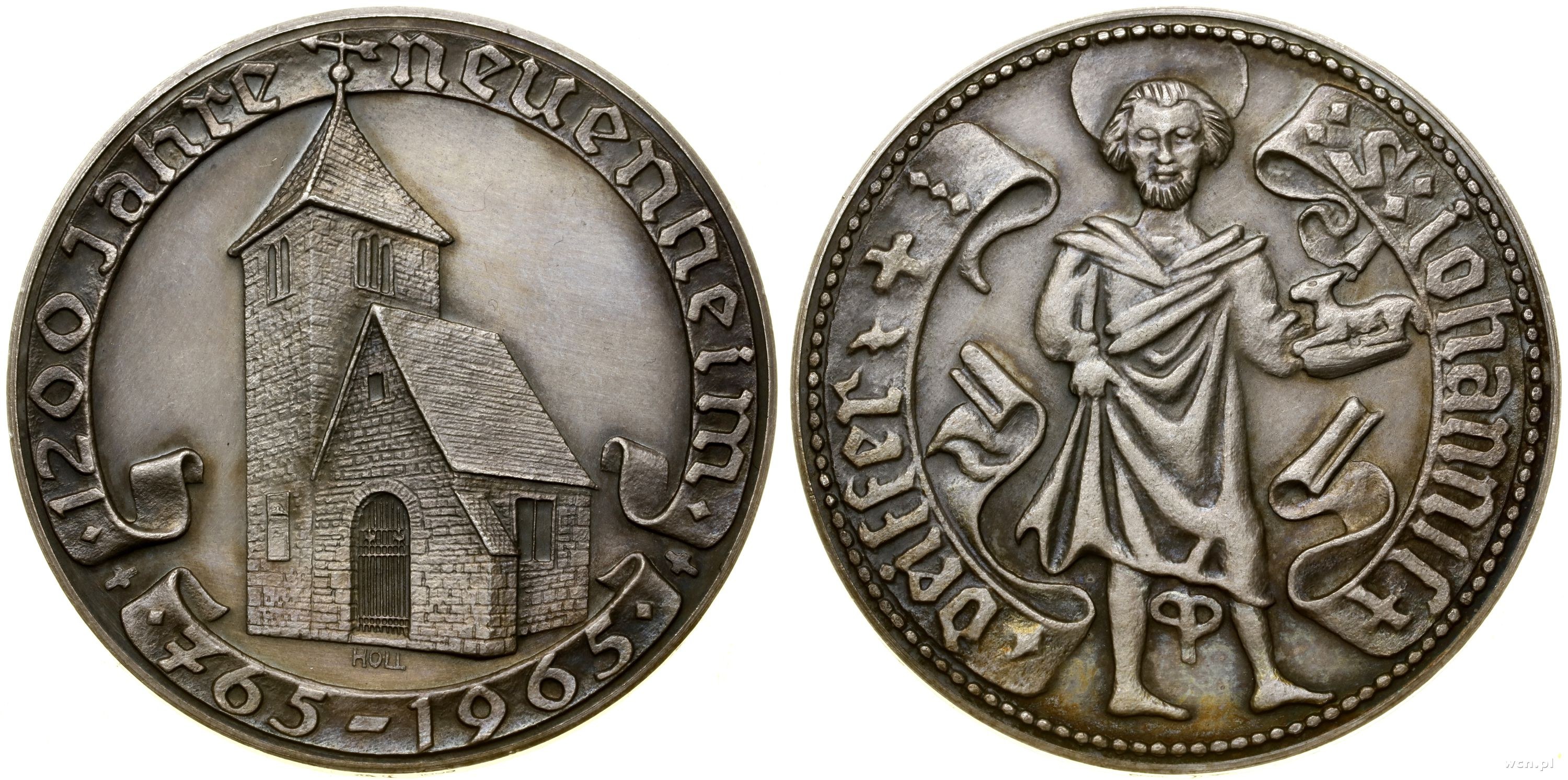 Aw: Widok wieży dawnego kościoła św. Jana, wokół dwie szarfy, na których 1200 Jahre neuensheim - • 765 - 1965 •, Rw: Św. Jan stojący na wprost, po bokach dwie szarfy, na których : S : iohannis + - deiffer +, Obrzeże: Punce srebra