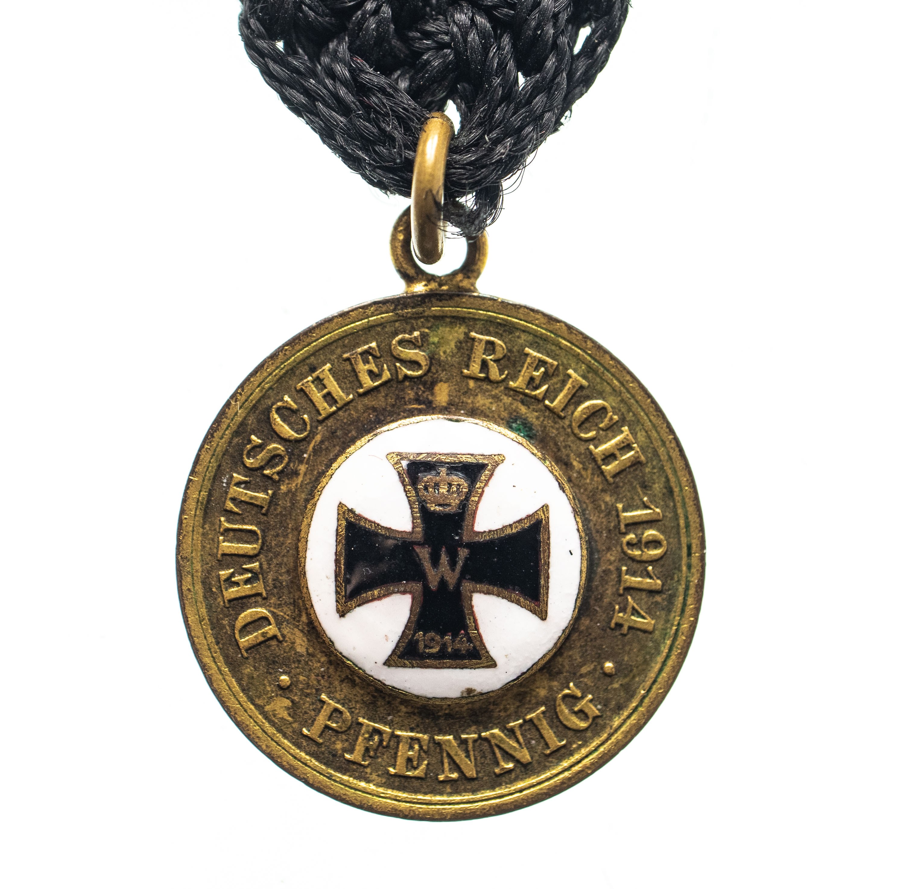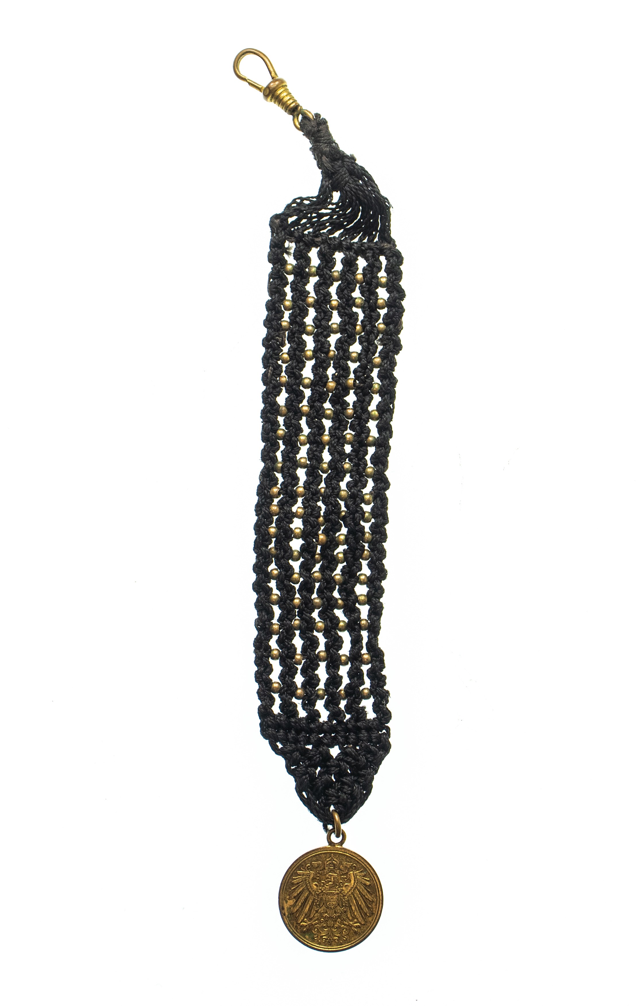 Dewizka wykonana z niemieckiej monety 1 fening 1914 r. z czarnym materiałowym haftem oraz zapięciem na końcu.