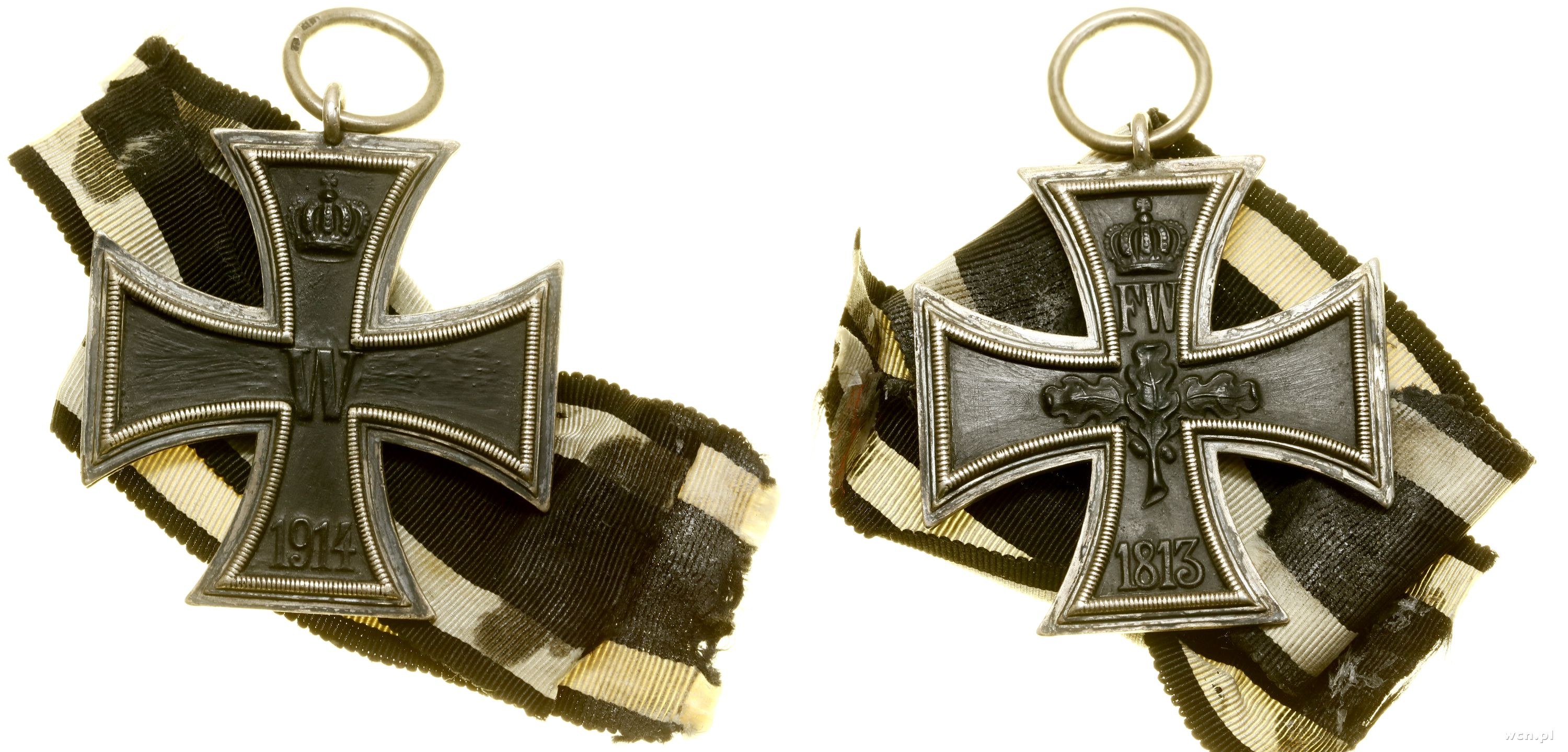 Krzyż, na środku którego litera W, na górnym ramieniu korona, na dolnym ramieniu 1914, na stronie odwrotnej na środku trzy liście dębu, nad nimi korona i FW, na dolnym ramieniu 1813, na pierścieniu do wstążki nabite 800 i nieczytelny imiennik, odznaczenie trzyczęściowe, mocowane na wstążkę, osobno wstążka, dodatkowo pudełko