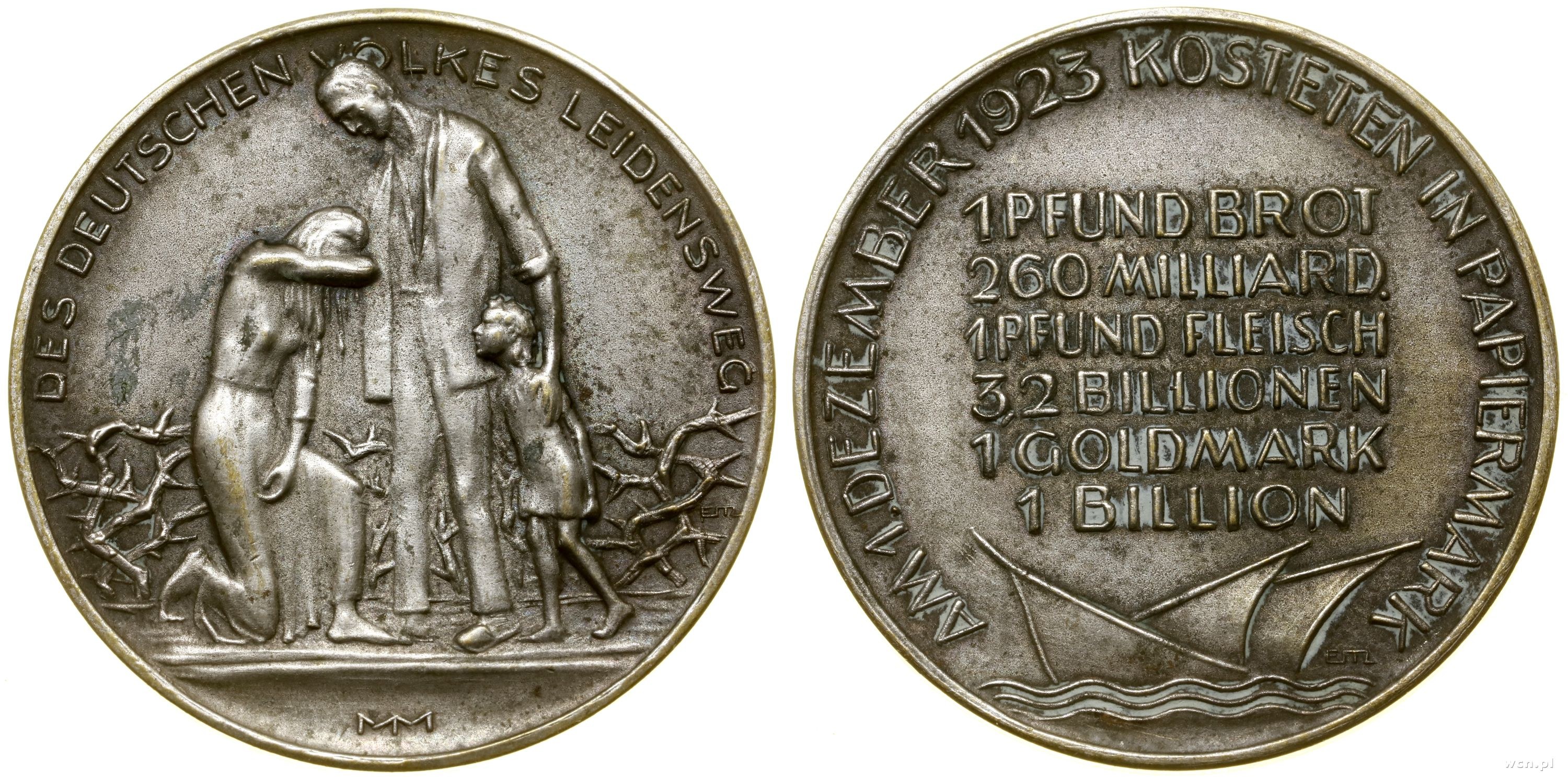 Aw: Rodzina z dzieckiem, w tle żywopłot cierniowy, na dole sygnatura MM, DES DEUTSCHEN VOLKES LEIDENSWEG, Rw: Tonący statek nad którym, AM 1. DEZEMBER 1923 KOSTETEN IN PAPIERMARK / 1 PFUND BROT / 260 MILLIARD. / 1 PFUND FLEISCH / 3,2 BILLIONEN / 1 GOLDMARK / 1 BILLION