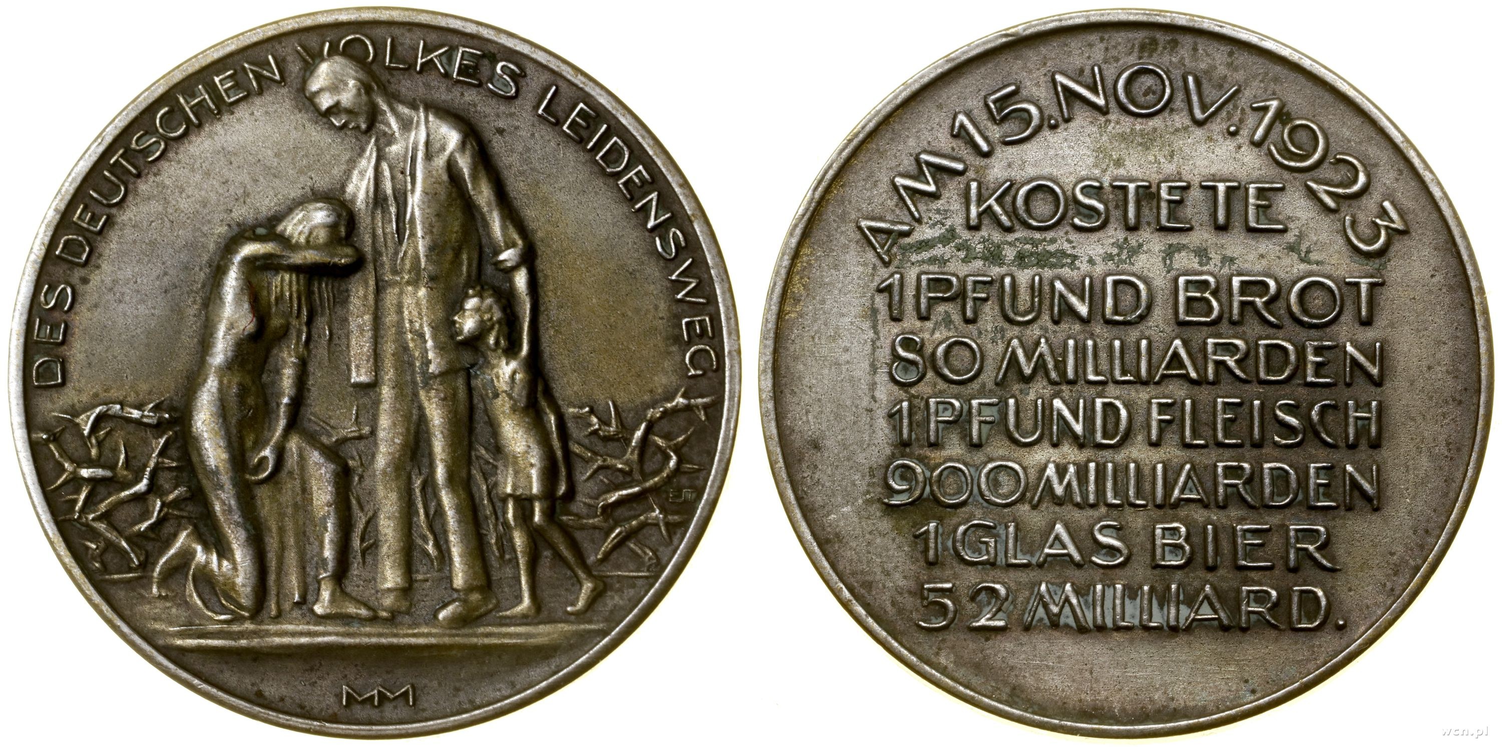Aw: Rodzina z dzieckiem, w tle żywopłot cierniowy, na dole sygnatura MM, DES DEUTSCHEN VOLKES LEIDENSWEG, Rw: AM 15. NOV. 1923 / KOSTETE / 1 PFUND BROT / 80 MILIARDEN / 1 PFUND FLEISCH / 900 MILIARDEN / 1 GLAS BIER / 52 MILIARD