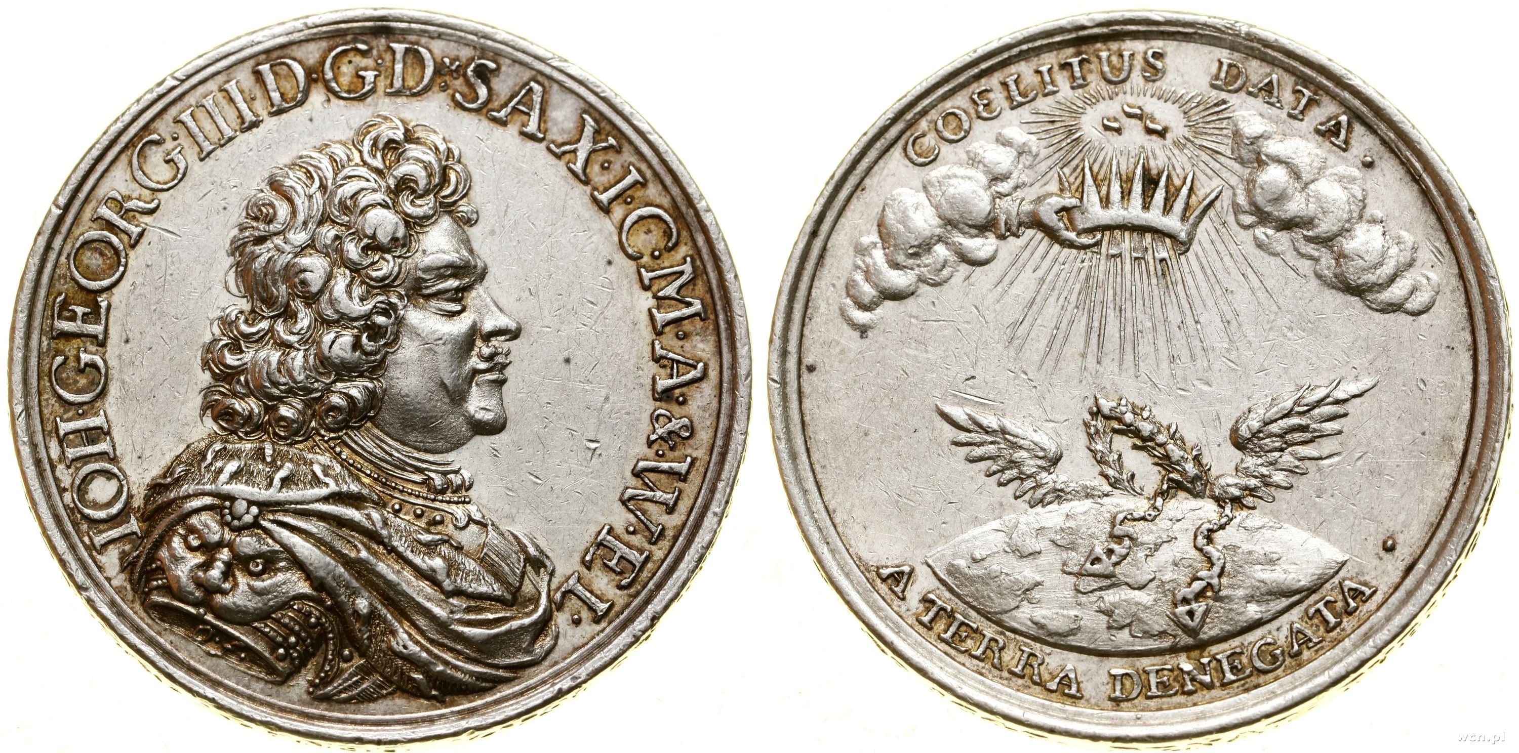 Aw: Popiersie w zbroi w prawo, legenda, Rw: Uskrzydlony wieniec laurowy, przykuty łańcuchami do globu ziemskiego, nad nim ręka wyłaniająca się z chmur, trzymajaca koronę, COELITUS / A TERRA DENEGATA, na obrzeżu data i legenda