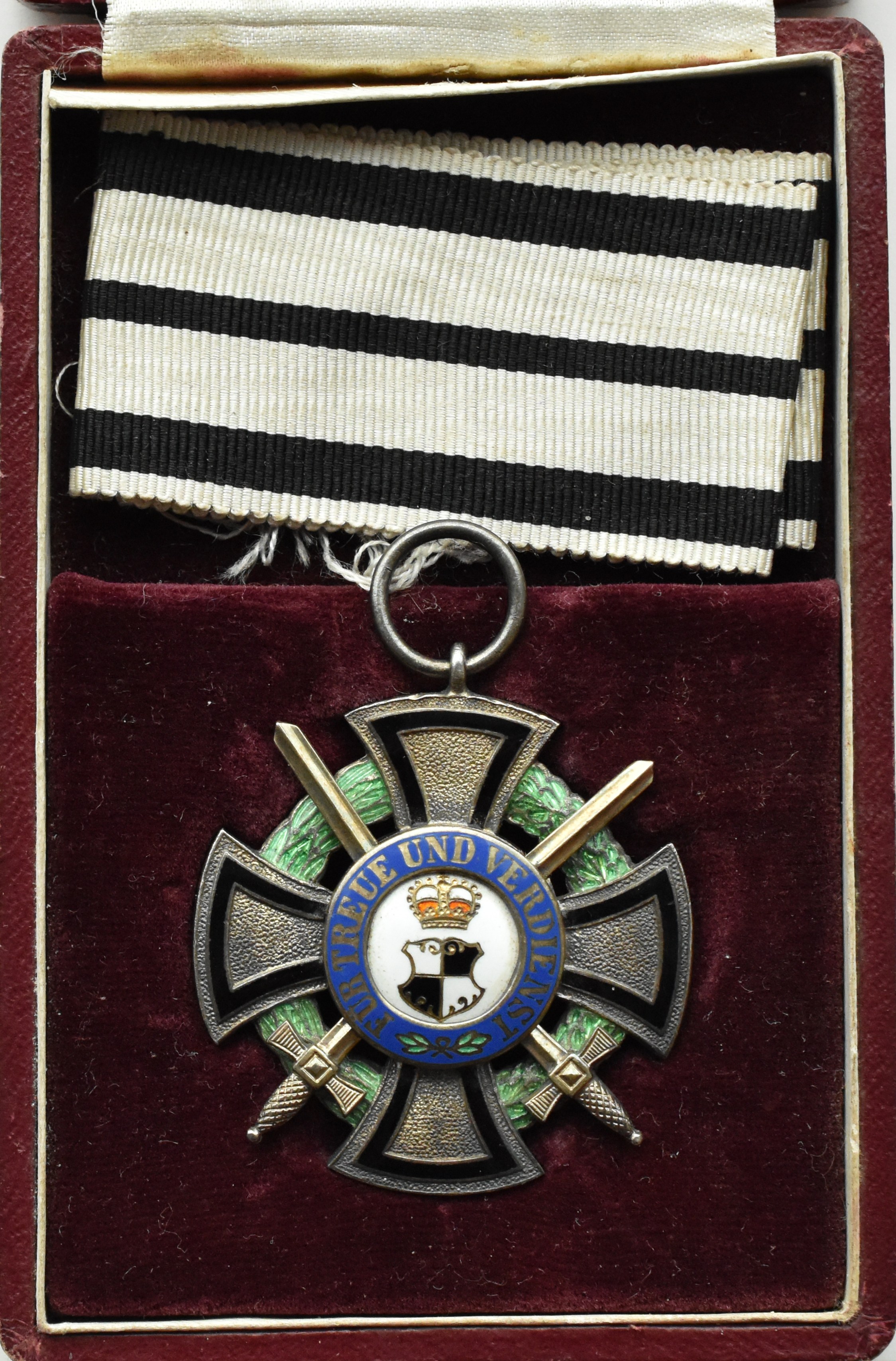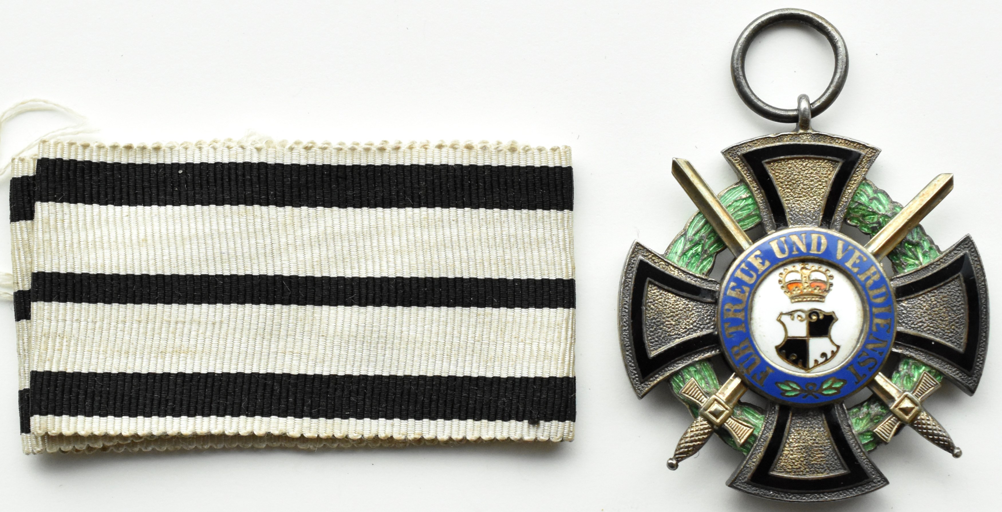 Niemcy, Order Książęcy Krzyża Honorowego Hohenzollernów III klasy z Mieczami, wstążka, oryginalne pudełko, RZADKIE