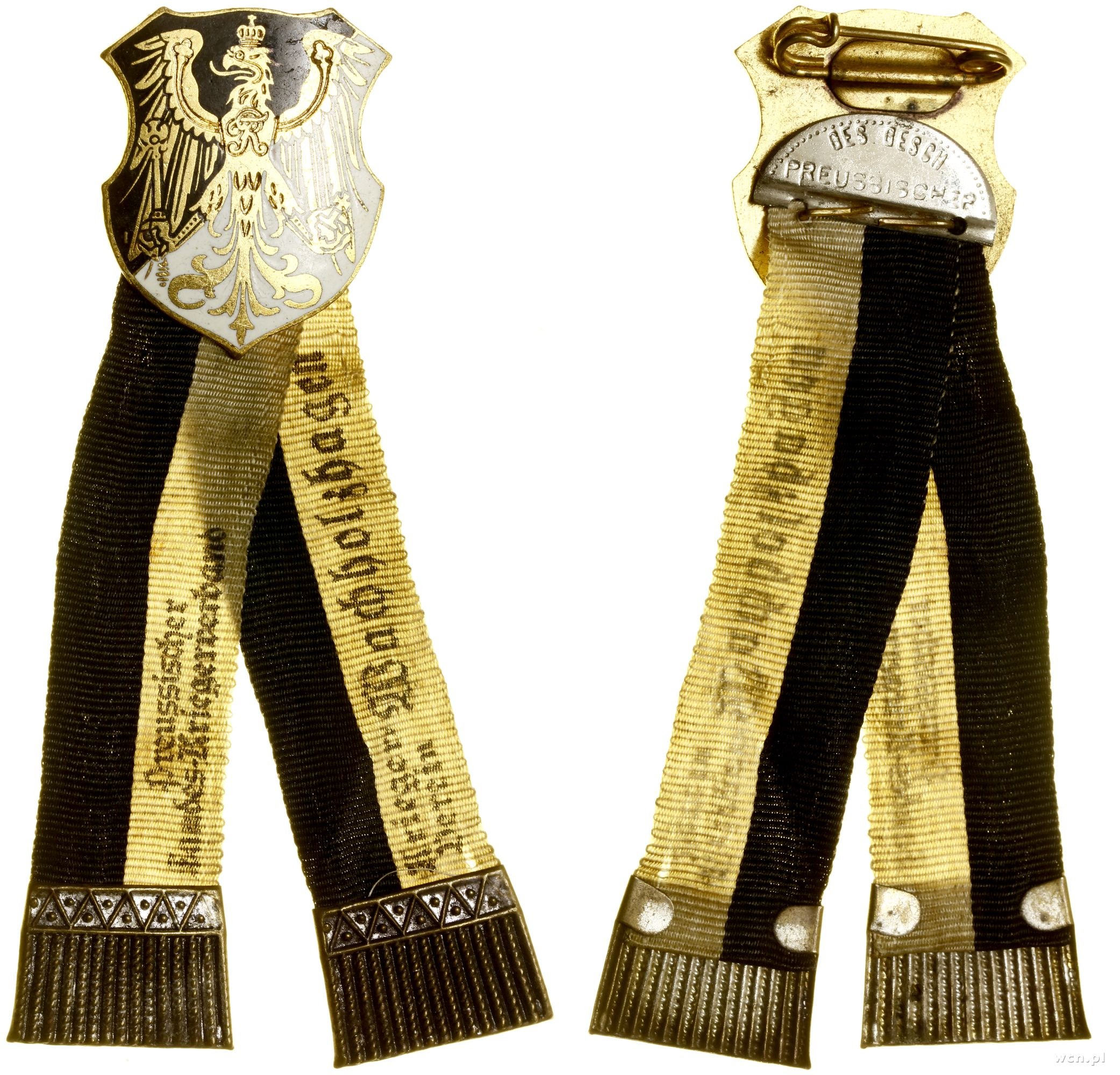 Tarcza z pruskim orłem, na stronie odwrotnej zatrzask sygnowany GES. GESCH. / PREUSSISCHER, na dole sygnatura HCH. TIMM / BERLIN C19, do wpinki przymocowana wstążka, na której Preussischer / Landes-Kriegerverband - Krieger / Verein Wachholzhagen (Konarzewo?)