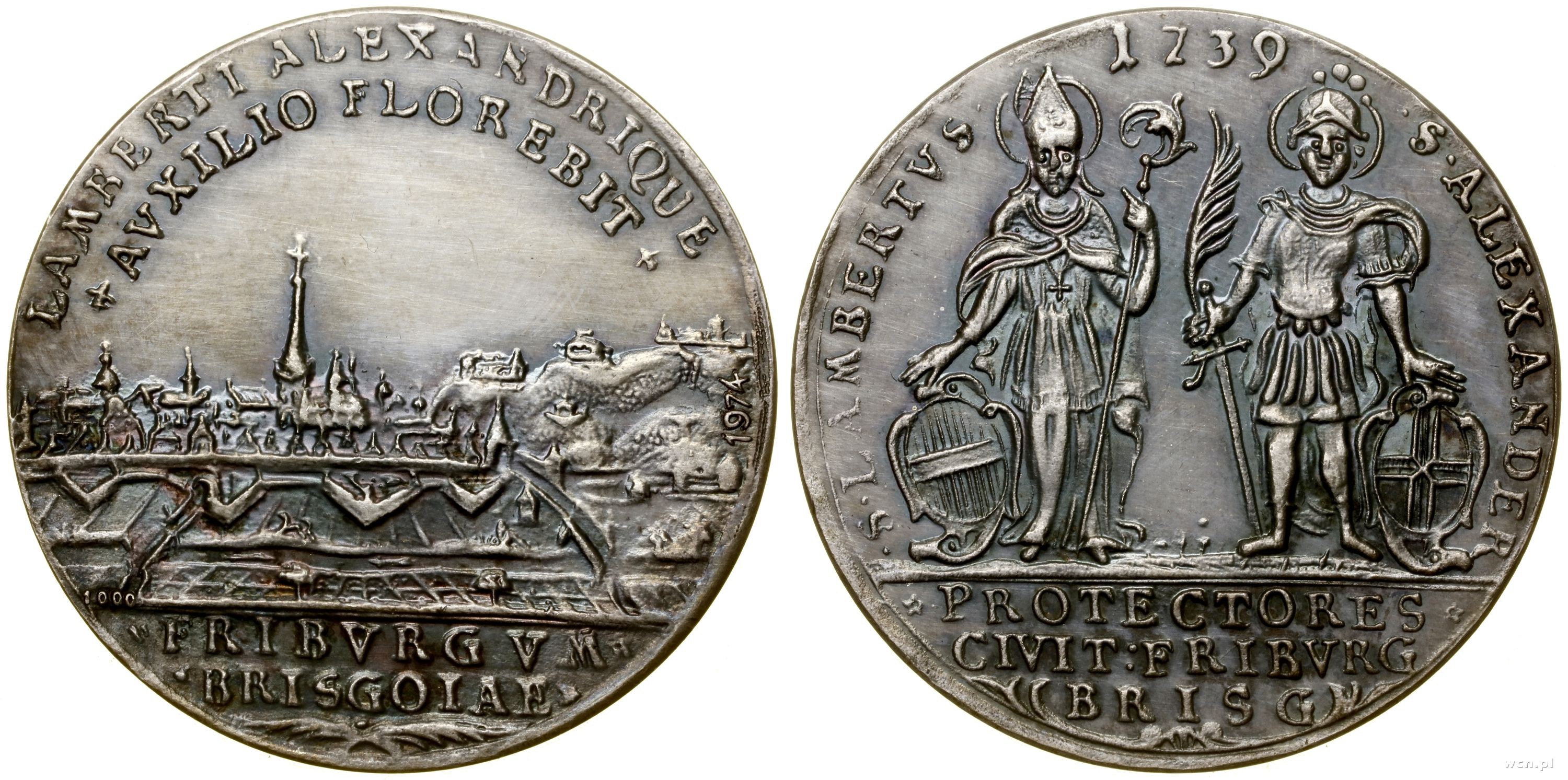 Aw: Panorama Freiburga, po prawej 1974, po lewej 1000, LAMBERTI ALEXANDRIQUE / + AVXILIO FLOREBIT +, w odcinku FRIBVRGVM / BRISGOLAE, Rw: Św. Lambert z kartuszem i pastorałem oraz św. Aleksander z kartuszem, mieczem i gałązką palmową, • S • LAMBERTVS • - 1739 - • S • ALEXANDER •, w odcinku PROTECTORES / CIVIT : FRIBVRG / BRISG