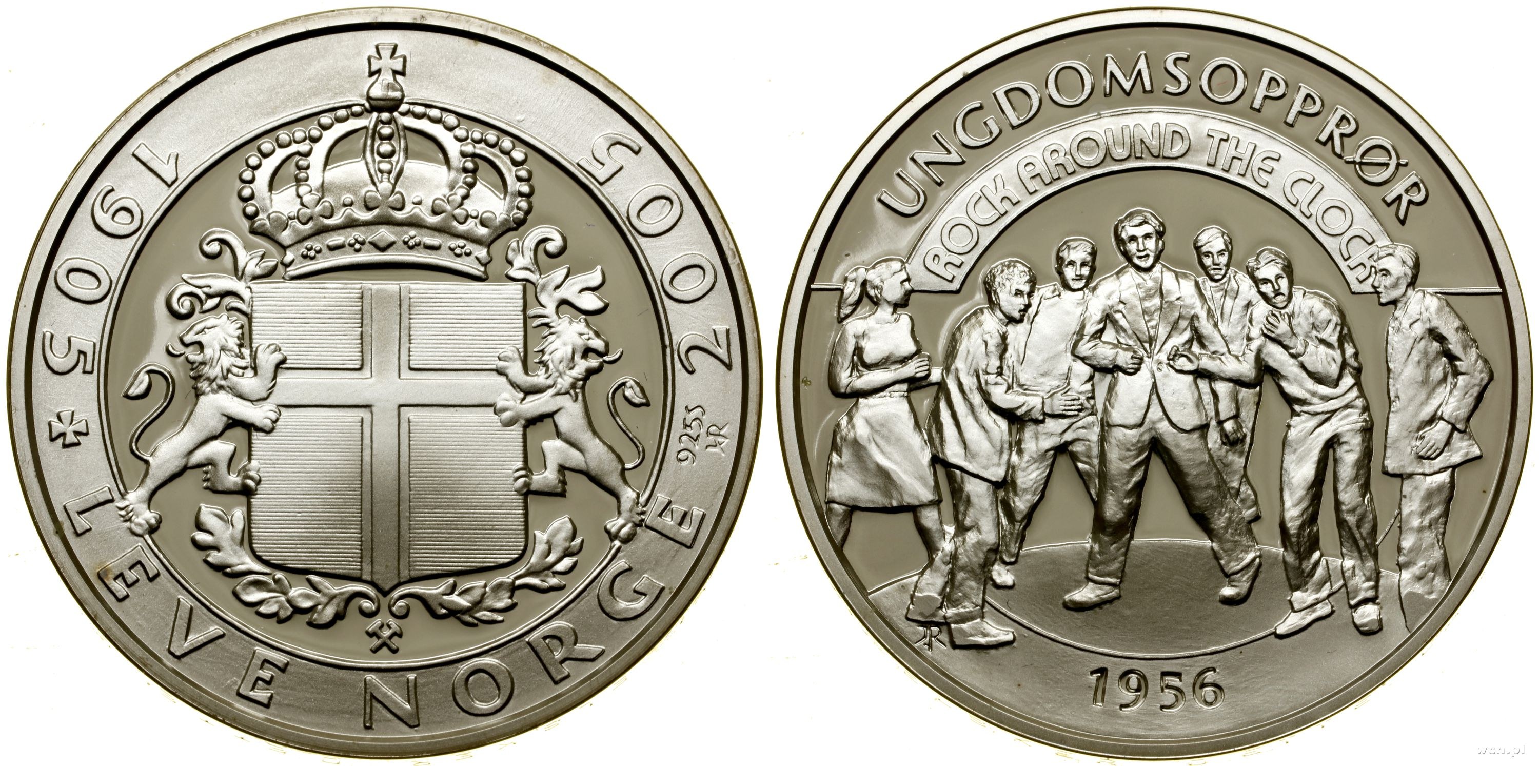 Aw: Grupa postaci na scenie, UNGDOMSOPPRØR / ROCK AROUND THE CLOCK, na dole 1956, Rw: Herb Norwegii, 1905 + LEVE NORGE 2005