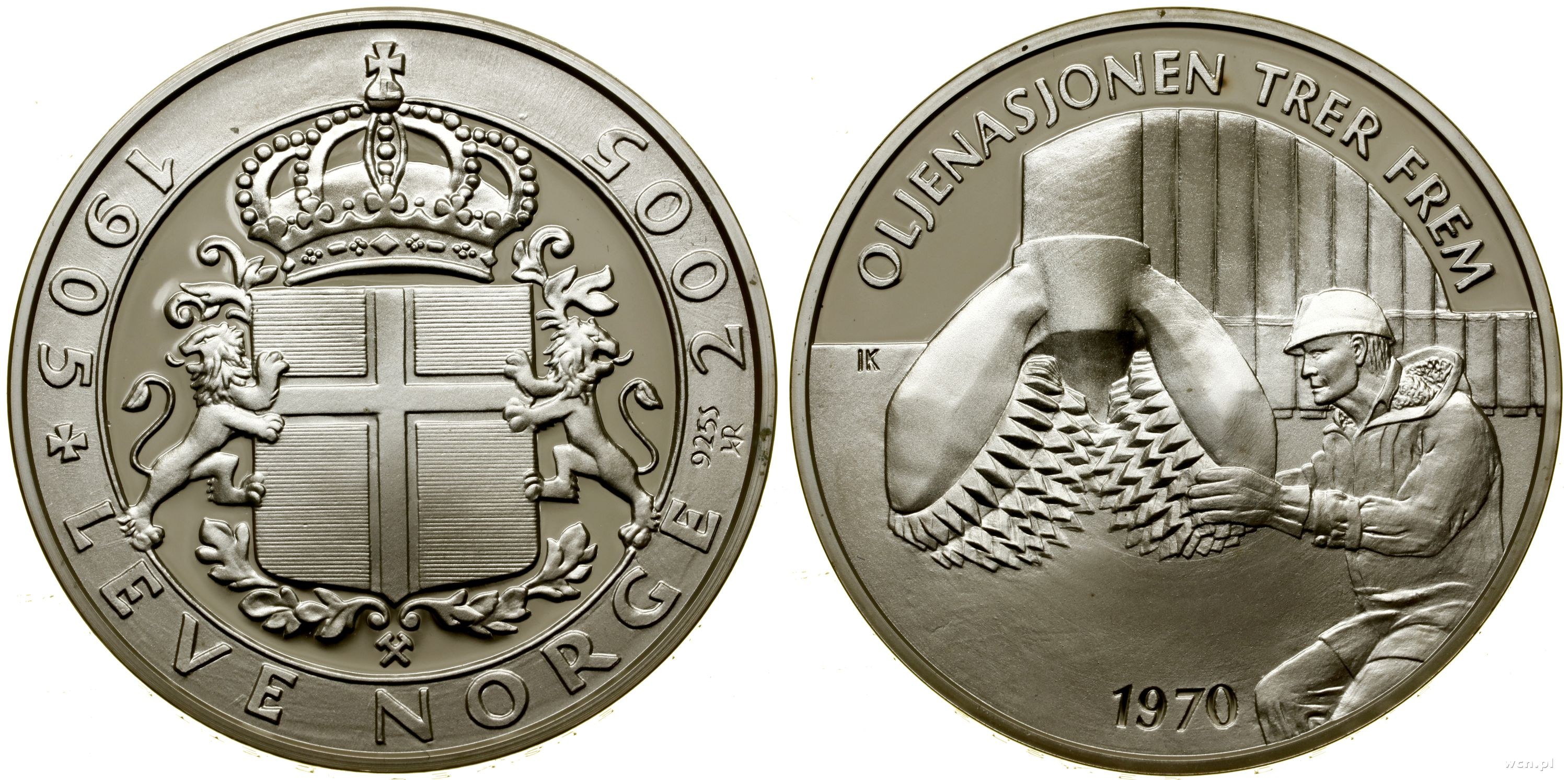 Aw: Robotnik przy wiertle, OLJENSAJONEN TRER FREM, na dole 1970, Rw: Herb Norwegii, 1905 + LEVE NORGE 2005