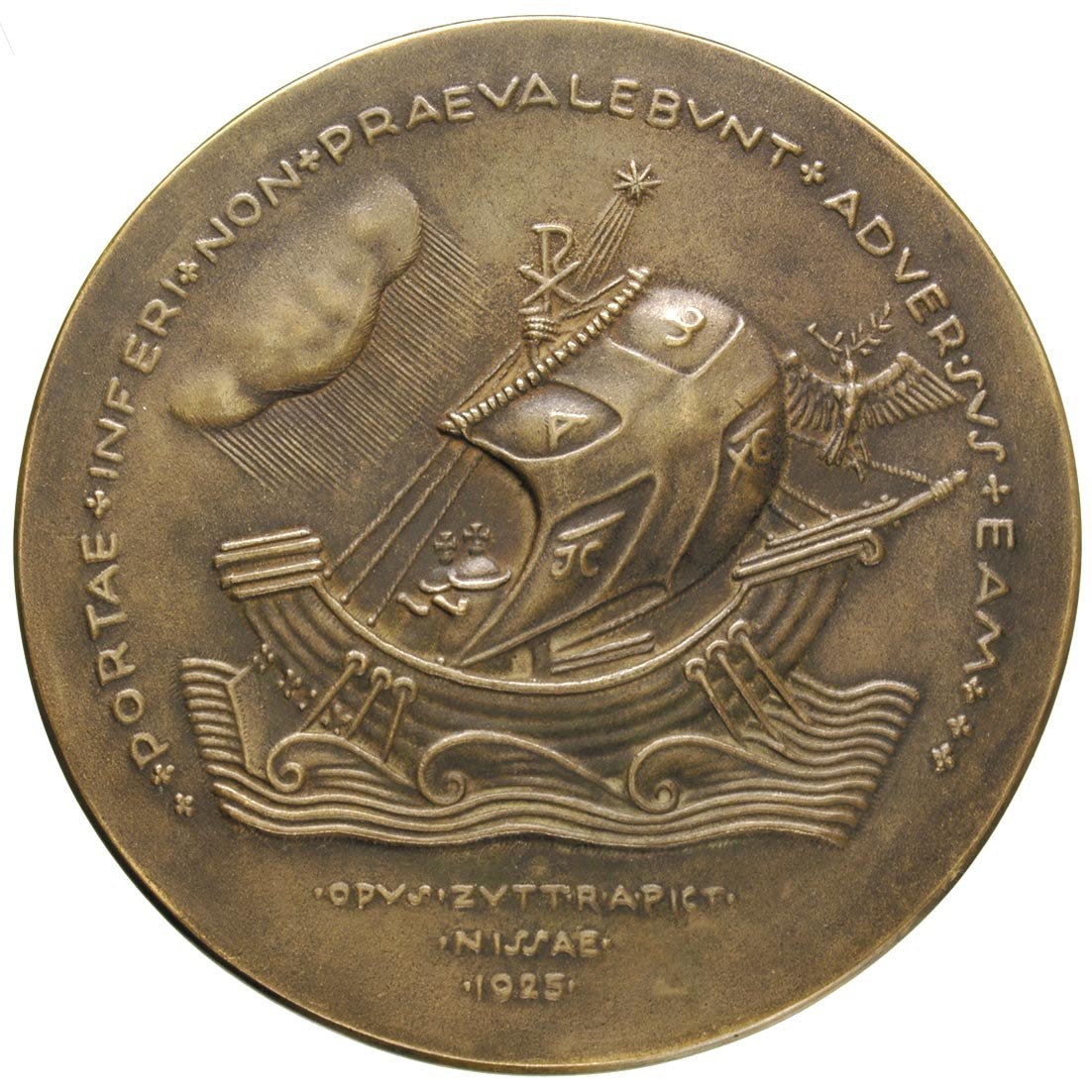 ŚLĄSK, Nysa - medal 1925 r., Aw: Galera na wzburzonym morzu i napis w otoku PORTAE INFERI NON PRAEVALEBVNT ADVER EAM, poniżej OPVS. ZVTT.R.A.PICT./NISSAE/1925, Rw: Przy krzyżu aniołowie z rękami złożonymi do modlitwy, powyżej napis ANNO SANCTO, poniżej PAX CHRISTI IN REGNO CHRISTI / ROMAE MCMXXV, brąz lany 139 mm