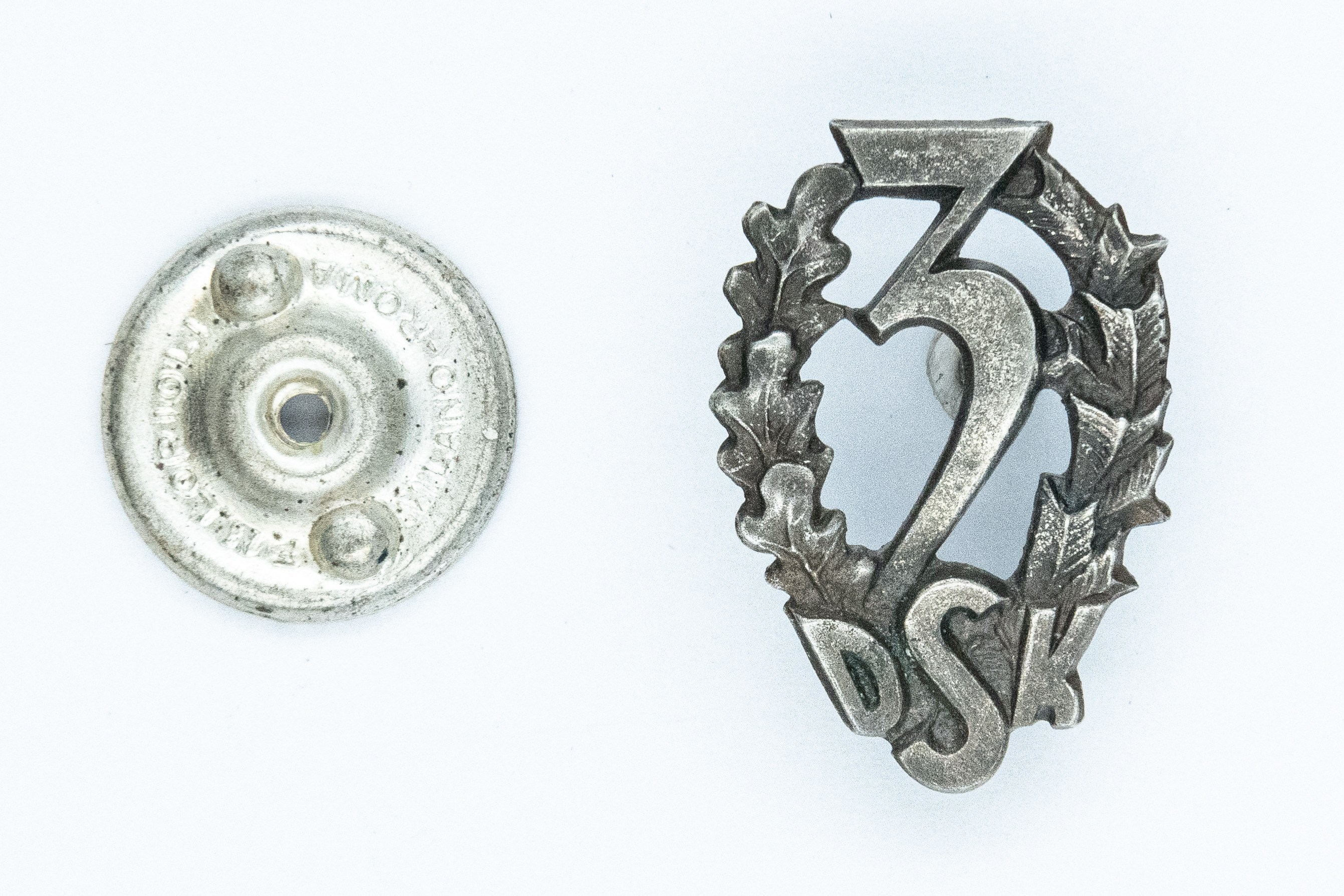 Odznaka 3 DSK na patkę kołnierzowa.18x26mm. Wykonana z metalu. Rewers z kontrą. Mocowana na słupek z nakrętką o średnicy 16mm, sygnowaną F.M. Lorioli Milano- Roma. Stan bardzo dobry.