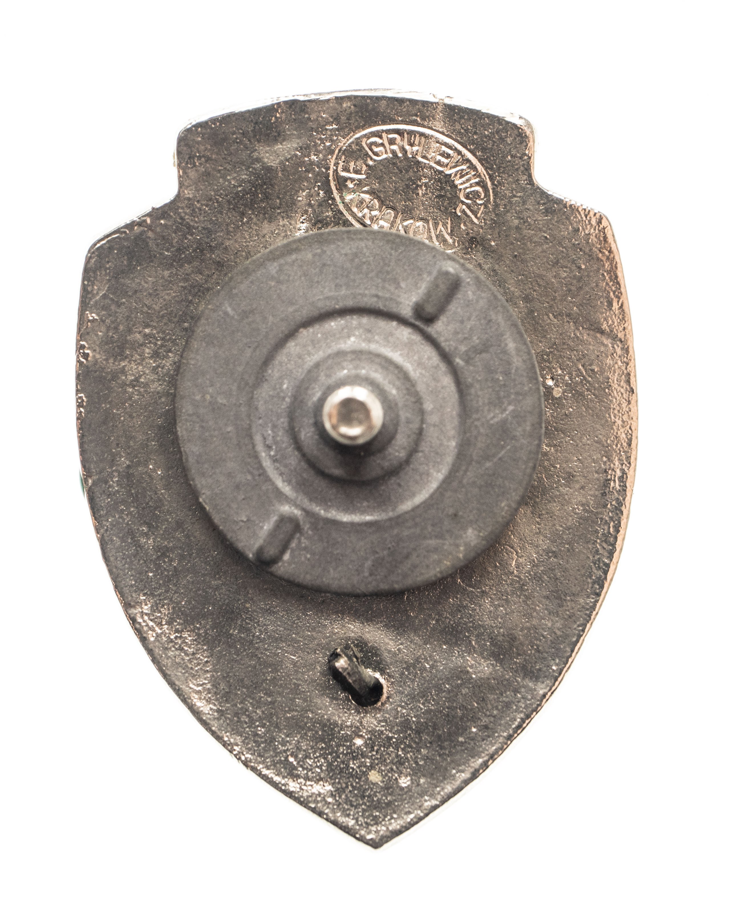 Odznaka emaliowana na słupku, wymiary około 4 x 3 cm. Odznaka sygnowana: E. GRYLEWICZ, KRAKÓW. Brak oryginalnej nakrętki.