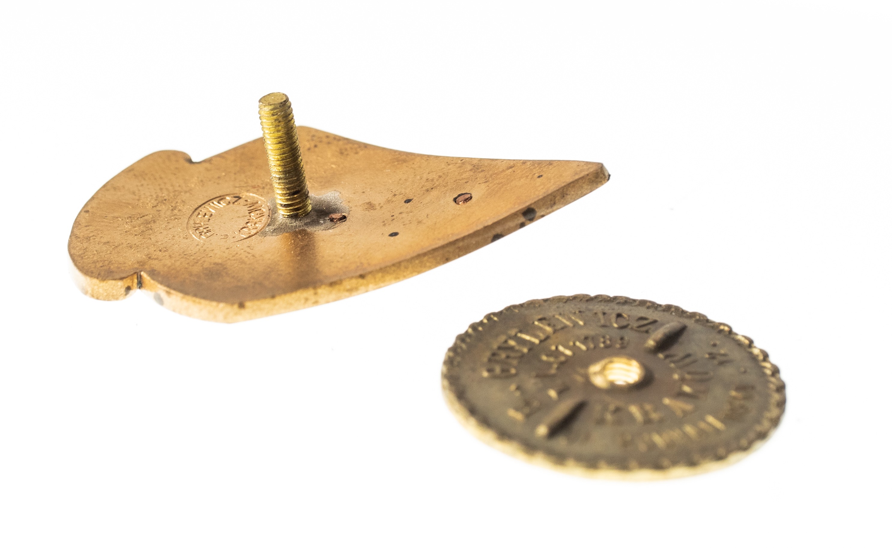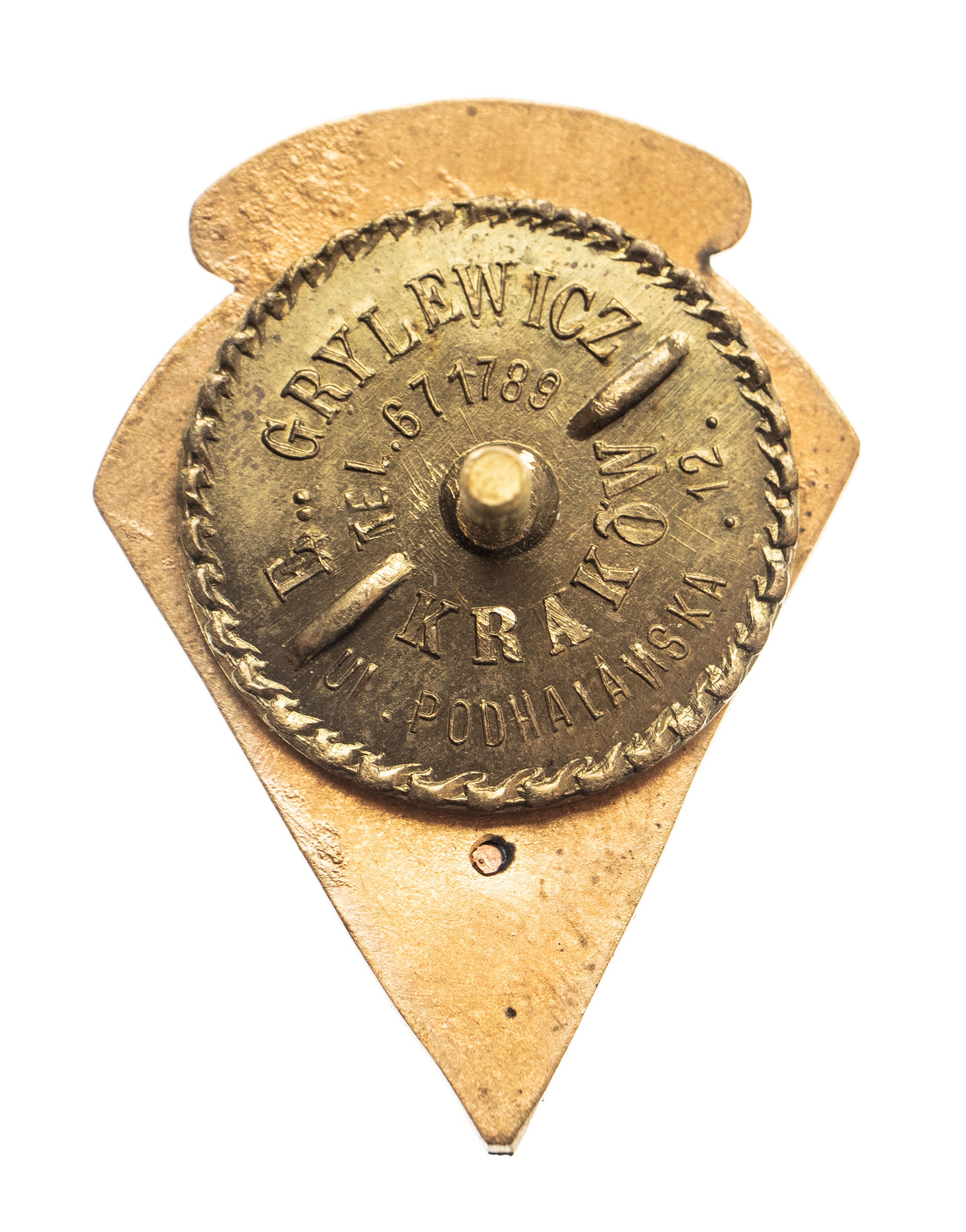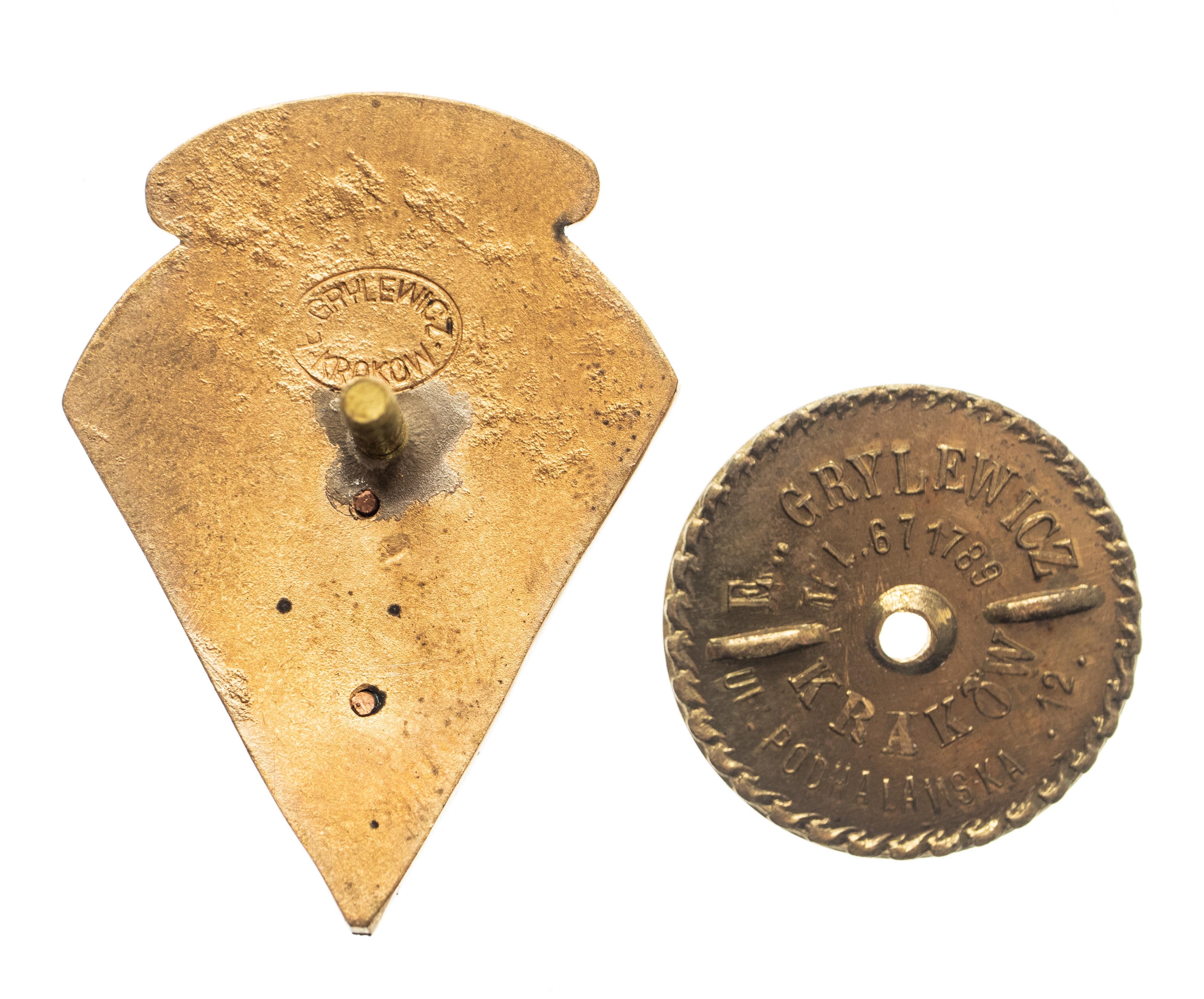 Odznaka biało-czarna na słupku, wymiary około 4 x 3,5 cm. Odznaka sygnowana: E. GRYLEWICZ, KRAKÓW. Nakrętka odznaki sygnowana E. GRYLEWICZ, telefon, KRAKÓW UL. PODHALAŃSKA.12.