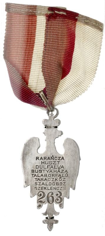 ODZNAKI WOJSKOWE, odznaka pamiątkowa internowanych żołnierzy polskiego korpusu posiłkowego na Węgrzech Rarańcza-Huszt” 1918, srebro 60 x 28, emalia, wstążka, Stela 5.21b, na stronie odwrotnej napisy, numer 263 i punce, bardzo rzadka i pięknie zachowana