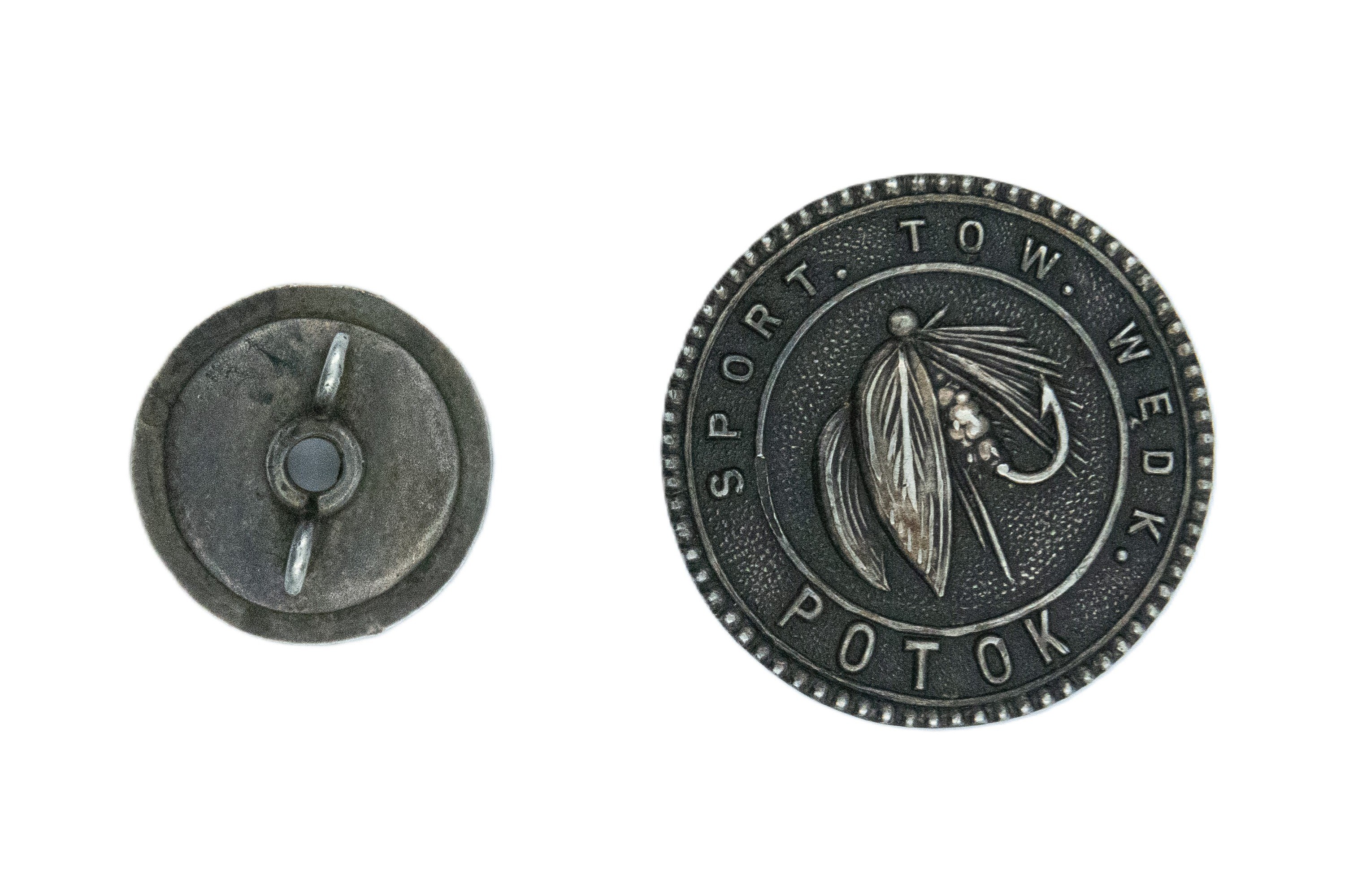 Odznaka Sportowego Towarzystwa Wędkarskiego POTOK, śr. 27 mm, mosiądz srebrzony, srebro?. Rewers gładki. Mocowanie na słupek z nakrętką. Nakrętka niesygnowana. Stan dobry.