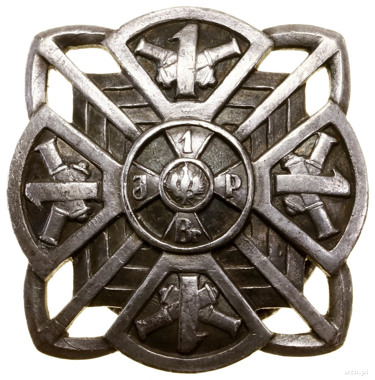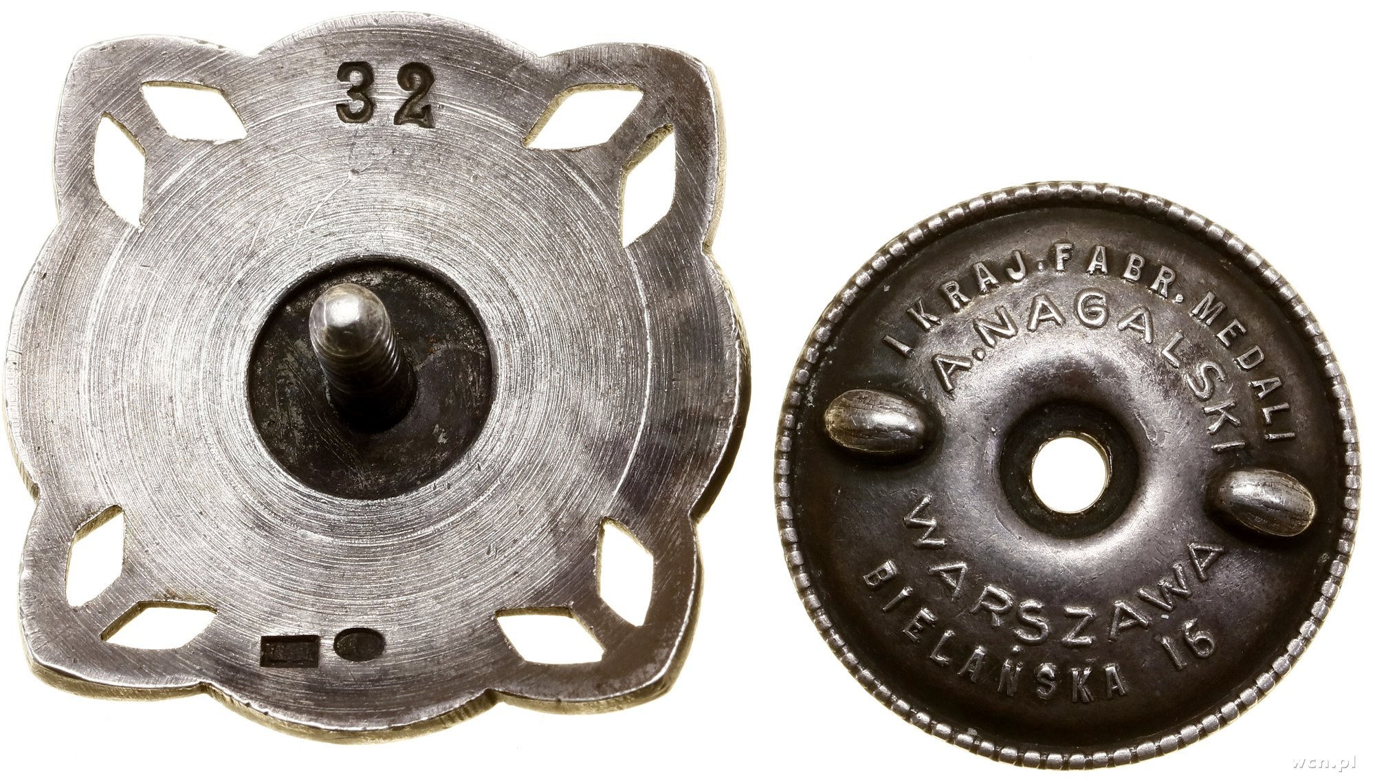 II Rzeczpospolita Polska (1918–1939), Oficerska Odznaka Pamiątkowa 1. Pułku Artylerii Polowej, od 1929; Krzyż złożony z czterech tarcz-toporów, w każdym cyfra 1 na tle skrzyżowanych armat, w kątach wici-strzały, w medalionie miniatura odznaki „Za wierną Służbę”, na stronie odwrotnej wybite 32, punca srebra i imiennik AN, odznaka jednoczęściowa, mocowana na słupek, nakrętka sygnowana I KRAJ MEDALJERNIA / A NAGALSKI - WARSZAWA / BIELAŃSKA 16; Sawicki/Wielechowski s. 228; srebro, 32.3 x 32.4 mm, 14.53 g (odznaka), 4.58 g (nakrętka); bardzo ładnie zachowana, niski numer.