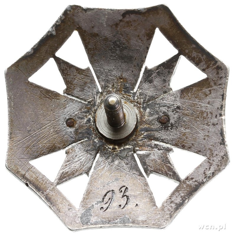 II RZECZPOSPOLITA POLSKA 1918-1939, oficerska odznaka pamiątkowa 3 Pułku Piechoty Legionów - Jarosław, wzór 2, odznaka dwuczęściowa, nakładka mocowana na dwa nity, Sawicki/Wielechowski s. 28, odznaka wykonana w srebrze 40 x 40 mm, niebieska, biała i żółta emalia, cyfra 3 wykonana ze złota, na stronie odwrotnej numer 93, nieco uszkodzona emalia