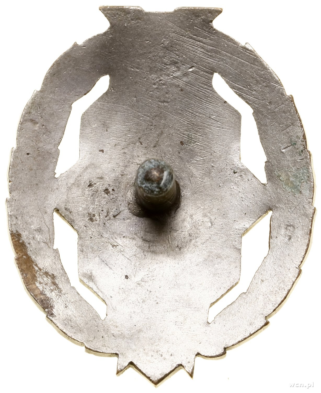 II Rzeczpospolita Polska (1918–1939), Oficerska Odznaka Pamiątkowa 38. Pułku Piechoty Strzelców Lwowskich, od 1930; Wieniec, w którym romb, w nim 38 / P. P. S. LW., u góry herb Lwowa, na dole Przemyśla, odznaka jednoczęściowa, mocowana na słupek, brak nakrętki; Sawicki/Wielechowski s. 76–77; tombak srebrzony, emalia, 33.6 x 40.9 mm, 18.08 g; miejscowe uszkodzenie emalii, miejscowo wytarte srebrzenie.