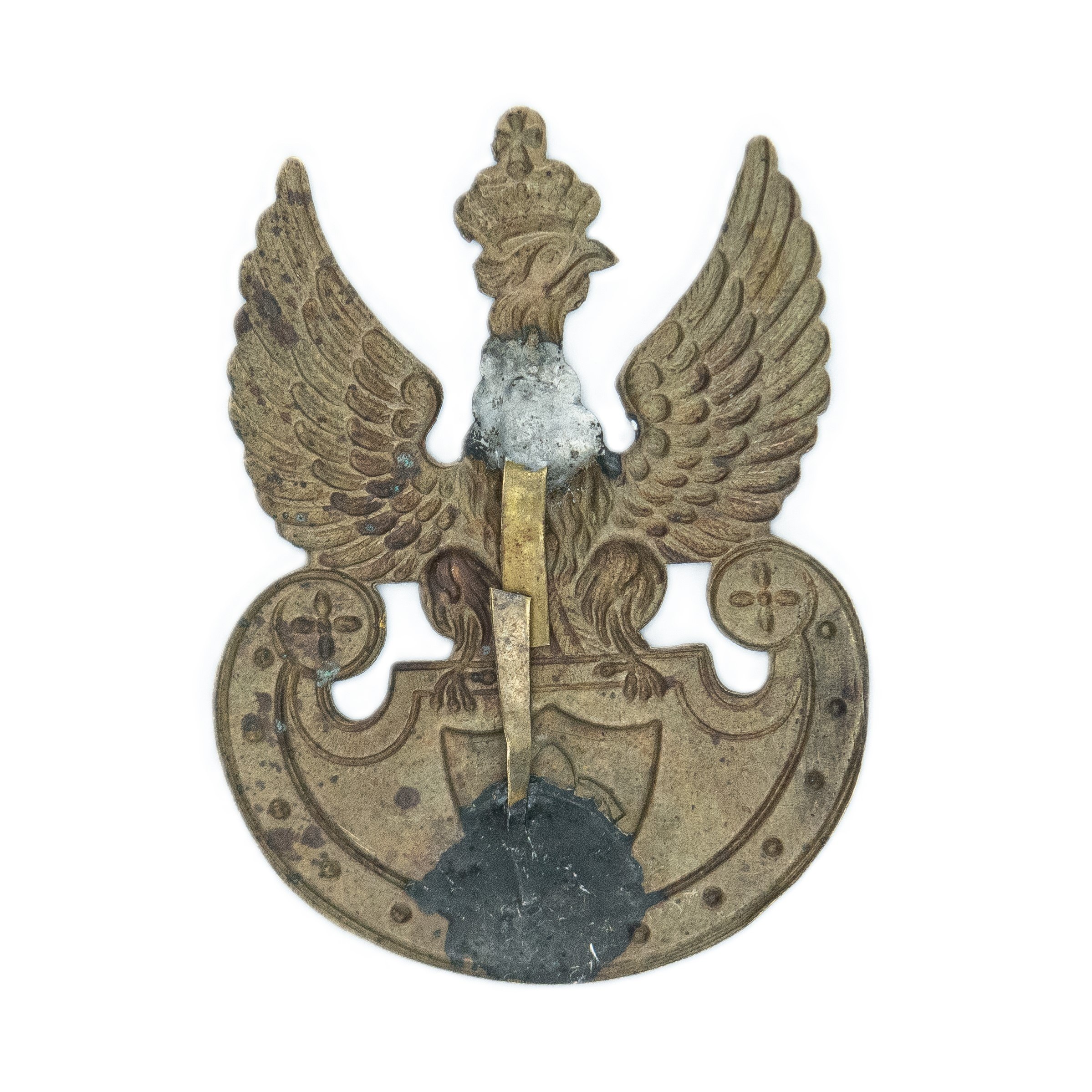 Orzeł 1916/1917, 53x40 mm, mosiądz. Na tarczy amazonek znajduje się emblemat saperów. Rewers z mocną kontrą. Mocowanie za pomocą dwóch zagiętych wąsów. Orzeł projekt: Czesław Jarnuszkiewicz (BM 42). Analogiczny orzełek opublikowany w książce: T. Zawistowski, Polskie orły do czapek w latach 1900-1917, Warszawa 2014, s. 130. Stan dobry.