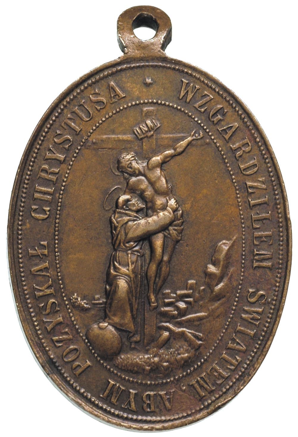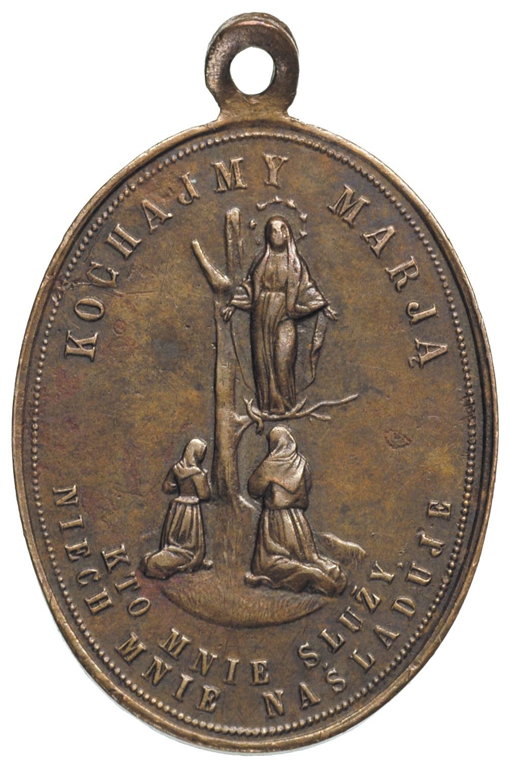 POLSKA, owalny medalik religijny z uszkiem, Aw: Objawienie Matki Bożej, poniżej dwie modlące się kobiety i napis KOCHAJMY MARJĄ ..., Rw: Chrystus na krzyżu podtrzymywany przez świętego i napis WZGARDZIŁEM ŚWIATEM ABYM POZYSKAŁ CHRYSTUSA, brąz 30 x 40 mm