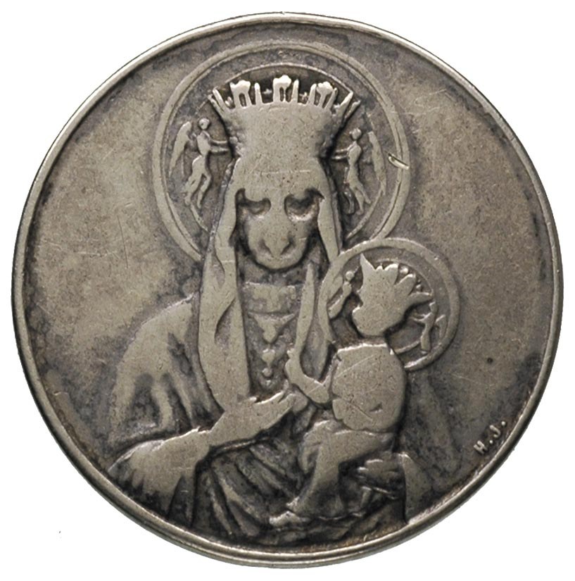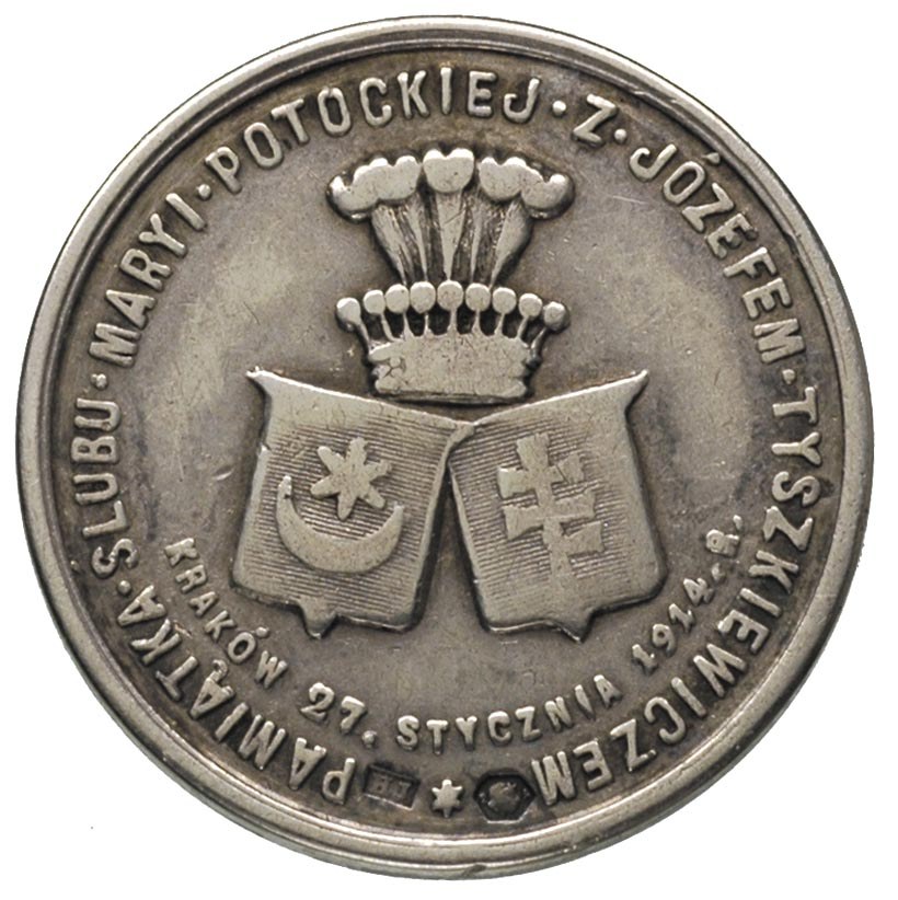 POLSKA, pamiątka ślubu Marii Potockiej z Józefem Tyszkiewiczem, 1914 r., Aw: Dwie tarcze herbowe, poniżej Kraków 27. stycznia 1914 r, w otoku napis, Rw: Obraz Matki Boskiej i sygn. H.J., srebro 25 mm, Strzałkowski 305 RR