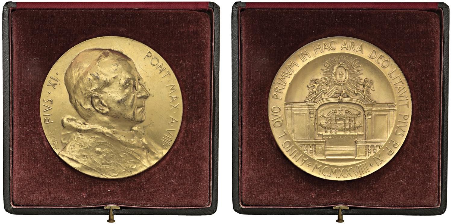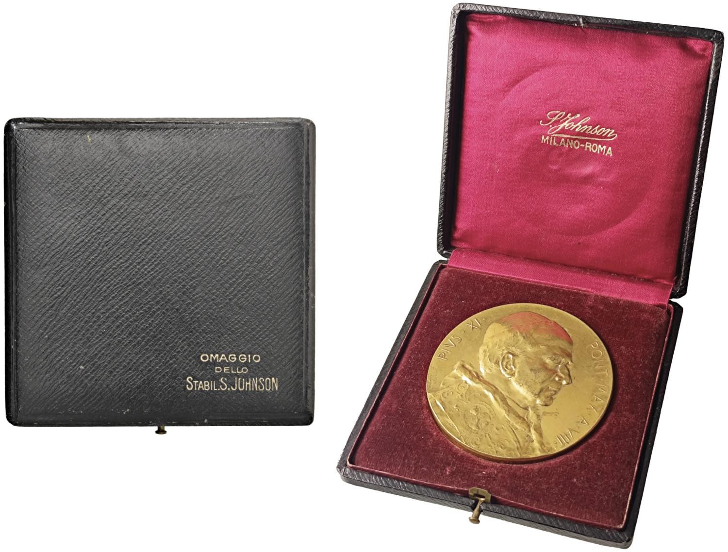 Pio XI (1922-1939) Medaglia straordinaria 1929 Anno VIII A ricordo del Giubileo Sacerdotale e Reliquia del cuore di S. Carlo - Opus: Albino Dal Castagnè ed Enrico Farè, edizione degli Stabilimenti Johnson - Cusumano-Modesti 193 - RR - AE dorato (g 129,02 - Ø 68 mm) Con cofanetto Johnson di emissione dedicato