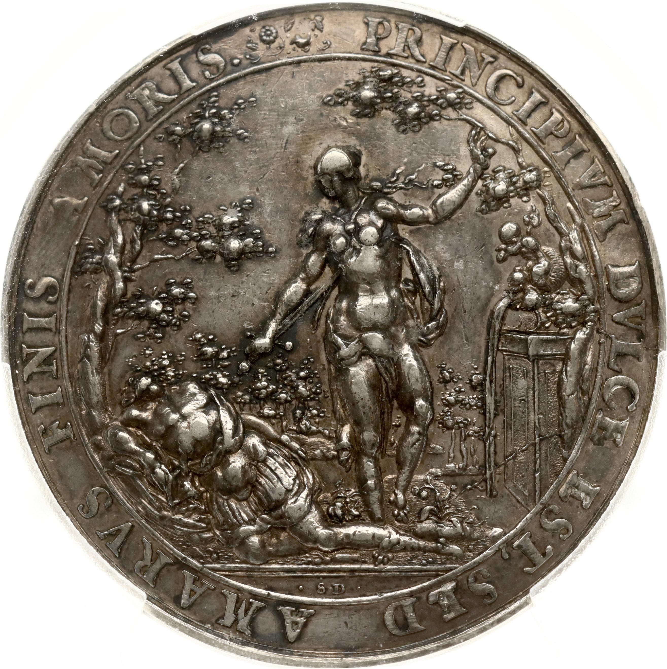 Poland, Danzig City. Silver Medal, ND undated, by S. Dadler, depicting the sorrow of love. Pyramus, dressed in antique style, lies with his head bowed; Thisbe, standing, thrusts a sword into her heart; to the right, water streams from a fountain in the form of a spouting dolphin with a mounted putto. Simultaneous depiction of the story of Hero and Leander. In the foreground, Leander sits, untying his clothes and bootlaces, looking to the right toward the strait. In the center, Leander is drowning; in the background, Hero collapses dead at the sight of his shattered body. Silver 50 mm, 31 g. Maue 156; Wiecek 85. PCGS XF Detail.