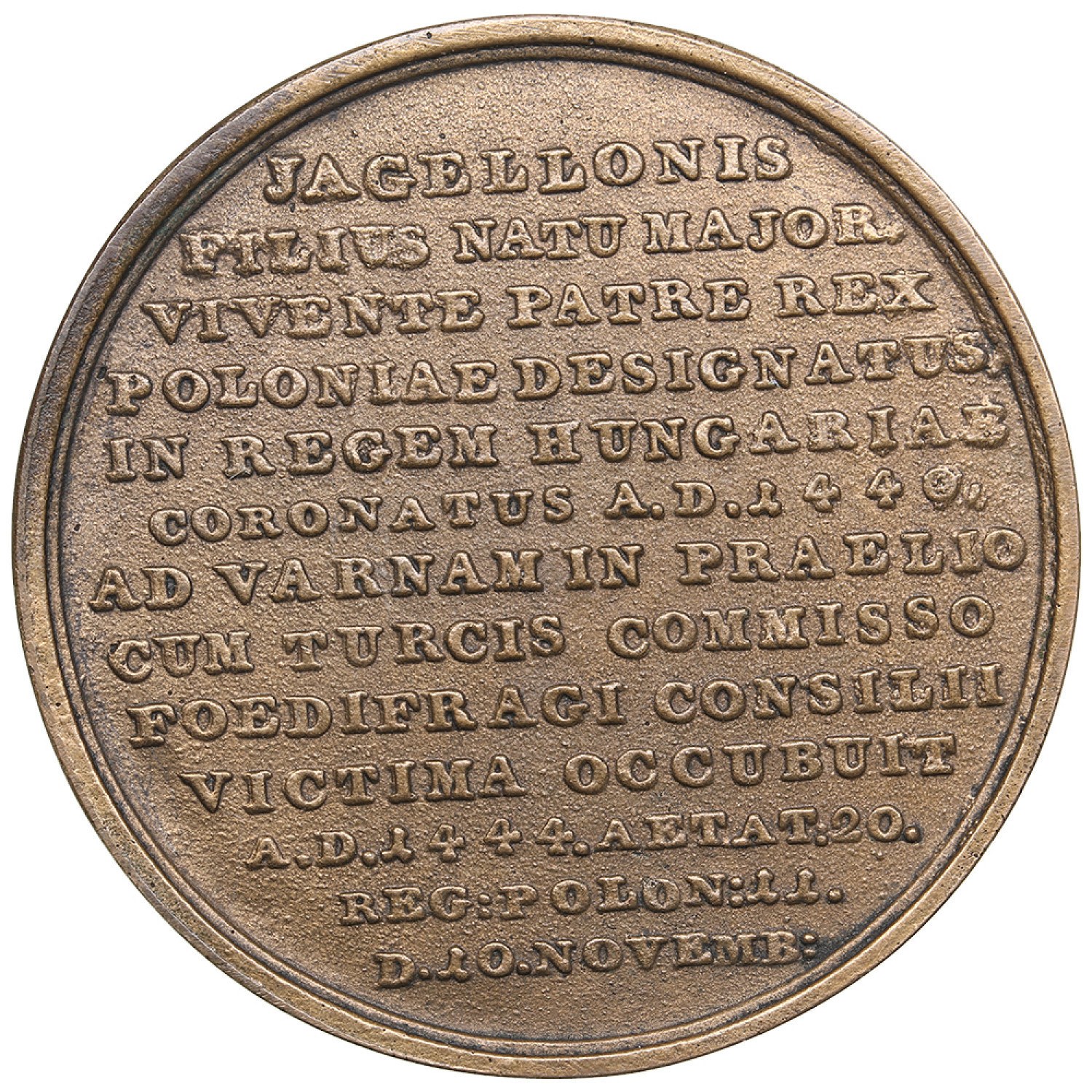 29.87g. 44mm. AU/AU. Obv: VLADISLAUS VARNENSIS. / Rev: AGELLONIS FILIUS NATU MAJOR, VIVENTE PATRE REX POLONIAE DESIGNATUS, IN REGEM HUNGARIAE CORONATUS A[nno] D[omini] 1440. AD VARNAM IN PRAELIO CUM TURCIS COMMISSO FOEDIFRAGI CONSILII VICTIMA OCCUBUIT A[nno] D[omini] 1444. AETAT[is] 20. REG[ni] POL[oniae] 11. D[ie] 10. NOVEMB[ris]. Raczyński 603. Rare!