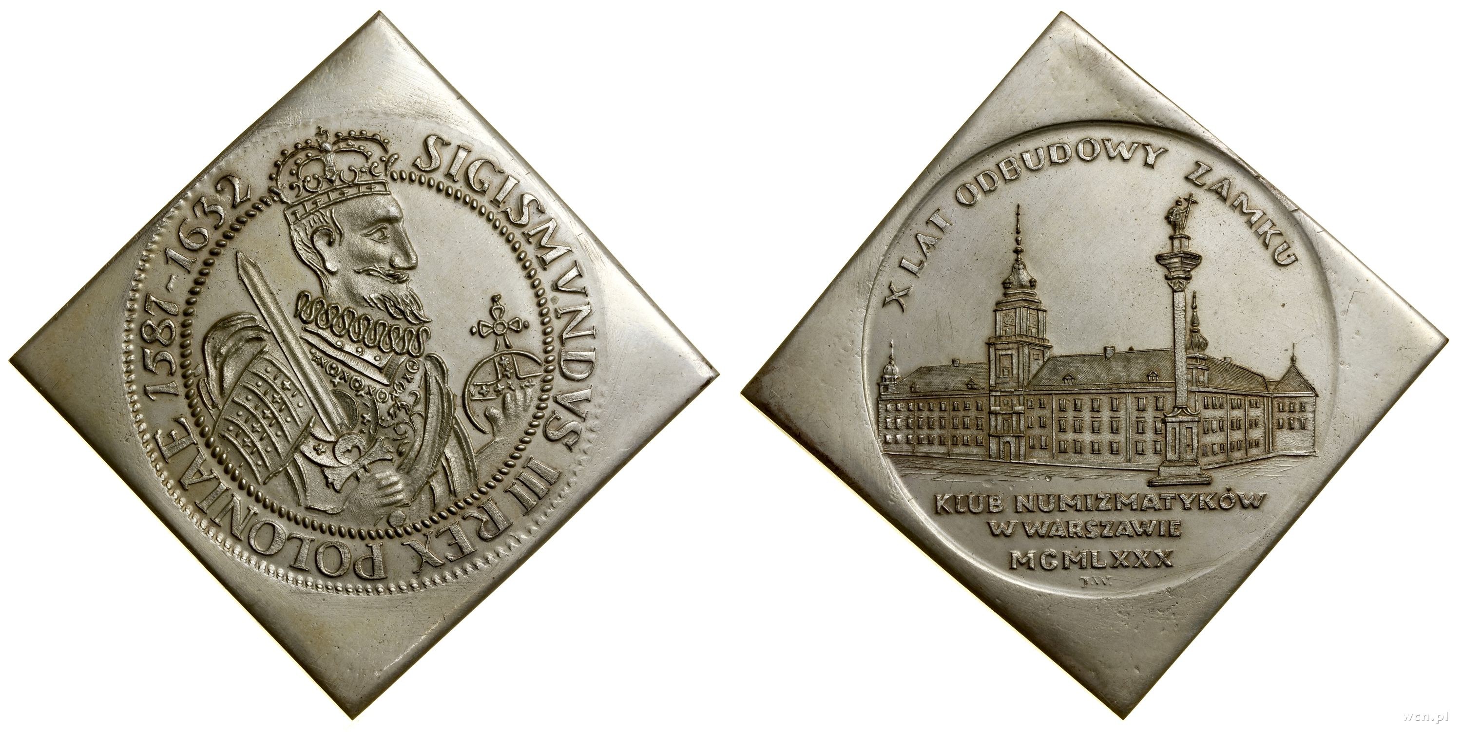 Aw: Widok odbudowanego zamku królewskiego, X LAT ODBUDOWY ZAMKU, w odcinku KLUB NUMIZMATYKÓW / W WARSZAWIE / MCMLXXX, Rw: Popiersie Zygmunta III Wazy w prawo, trzymającego miecz i jabłko panowania, SIGISMVNDVS III REX POLONIAE 1587-1632, medal sygnowany JW (Jerzy Wasyńczuk)