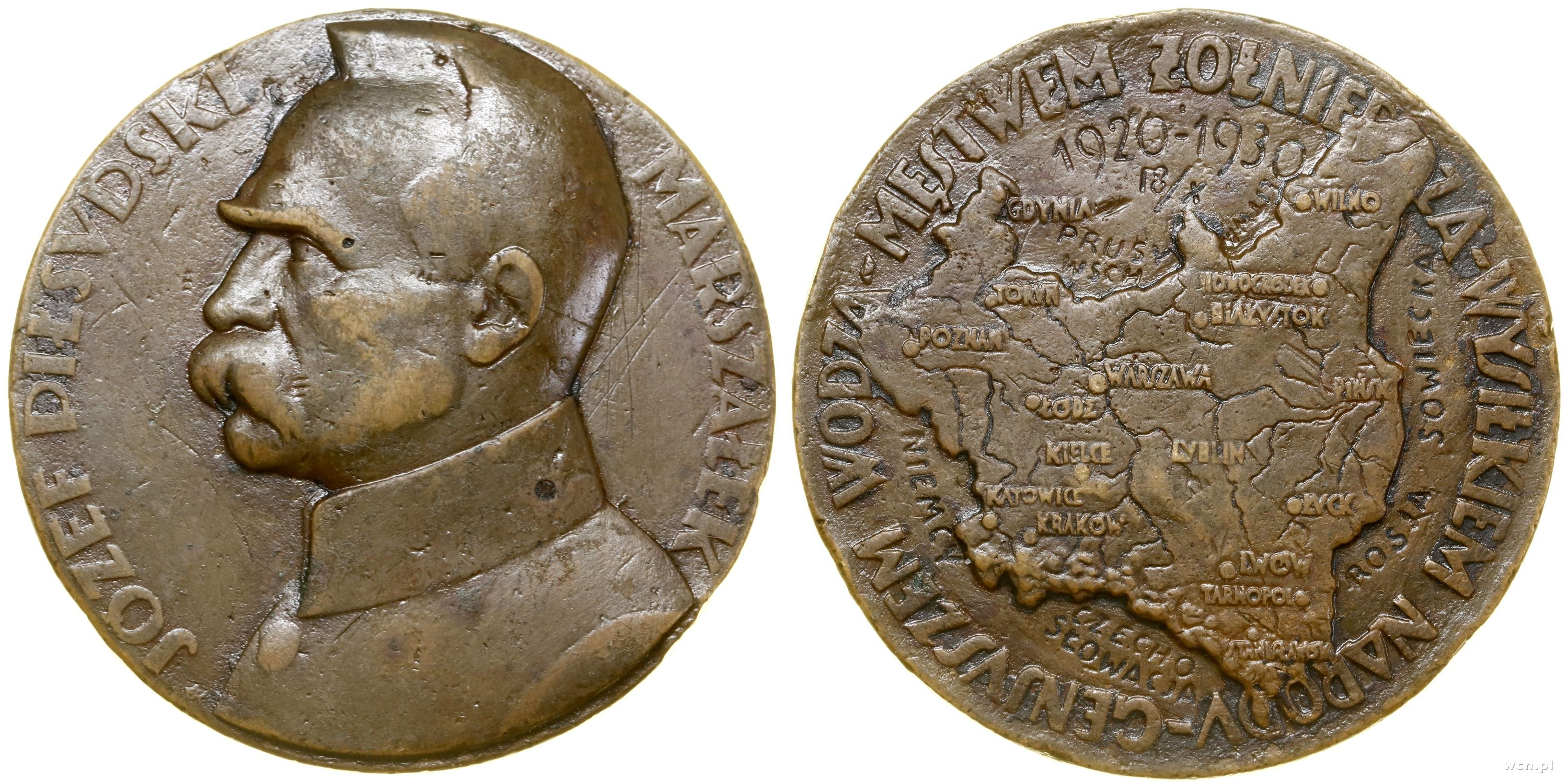 Aw: Popiersie w lewo, MARSZAŁEK JÓZEF PIŁSUDSKI, Rw: Mapa Polski, na górze 1920-1930 / 18/X, MĘSTWEM ŻOŁNIERZA - WYSIŁKIEM NARODU - GENIUSZEM WODZA, projektował Józef Aumiller