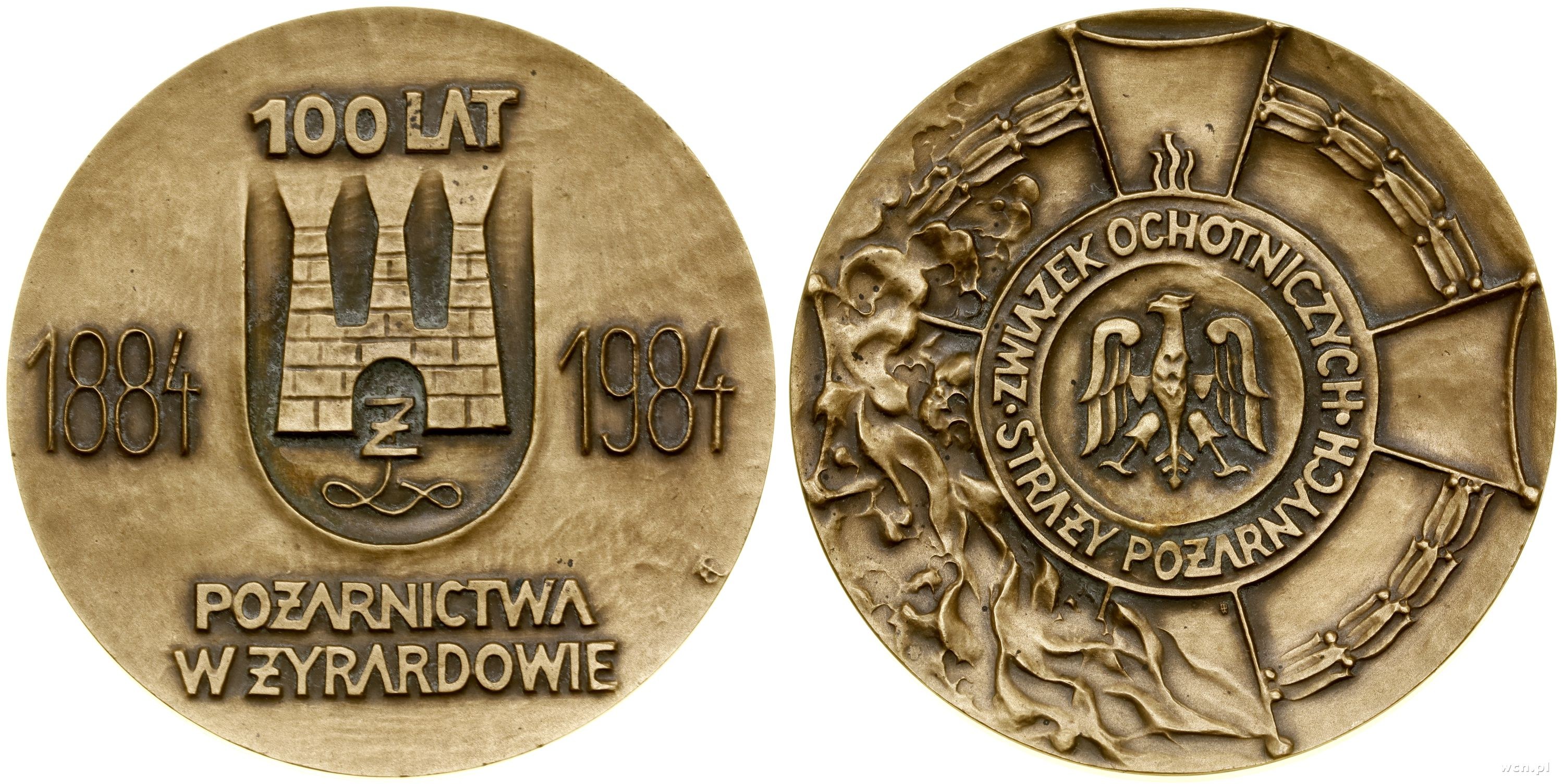 Aw: Stylizowany herb Żyrardowa, wyżej 100 LAT, niżej POŻARNICTWA / W ŻYRARDOWIE, po bokach 1884 - 1984, Rw: Krzyż Związku Ochotniczych Straży Pożarnych częściowo objęty płomieniami, projektował i wykonał Jan Jaworski