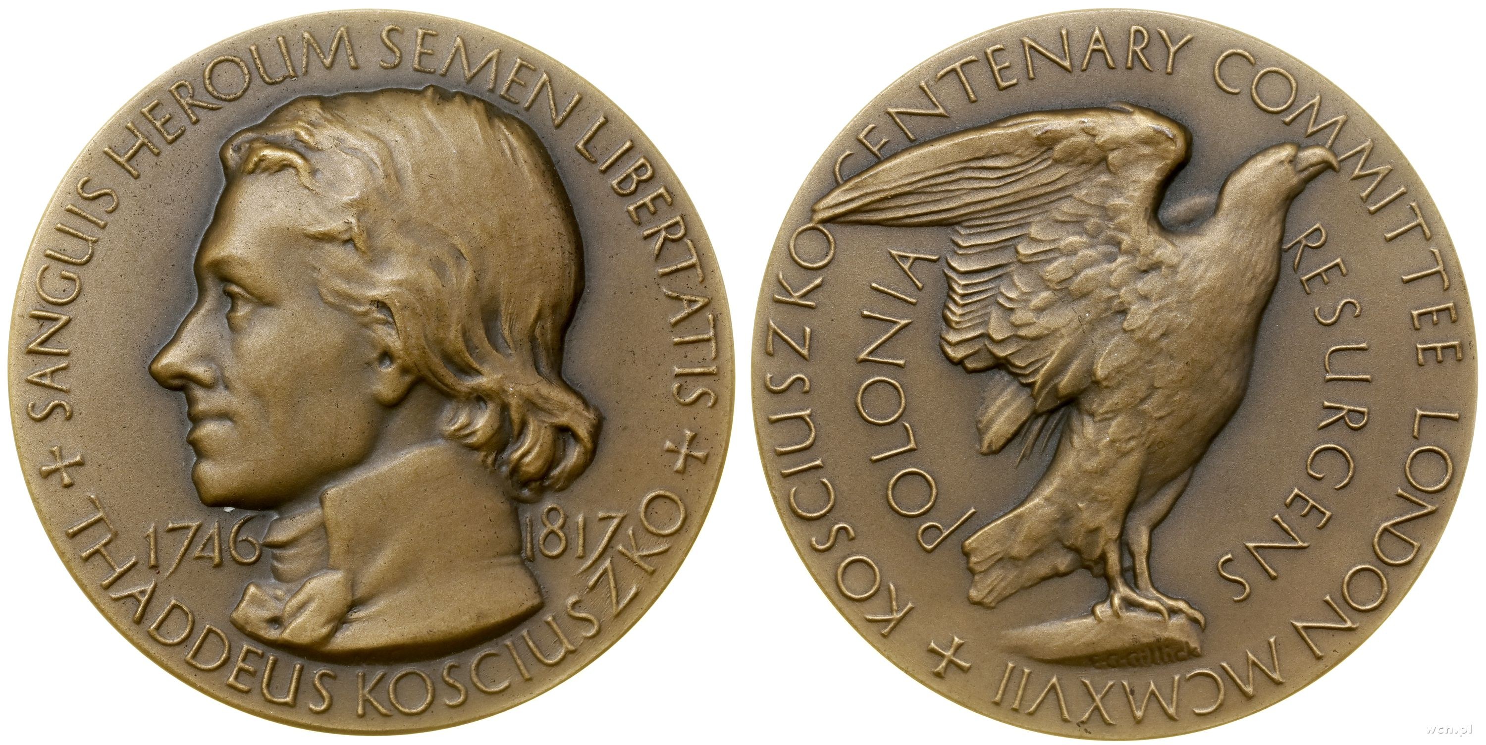 Aw: Głowa w lewo, po bokach 1746 - 1817, SANGUIS HEROUM SEMEN LIBERTATIS + THADDEUS KOSCIUSZKO +, Rw: Orzeł startujący do lotu, na dole sygnatura F. G. Gilick, POLONIA - RESURGENS / + KOSCIUSZKO CENTENARY COMMITTEE LONDON MCMXVII, Obrzeże: RE-ISSUED LONDON 1967, projektowali Mary i Ernest George Gillick