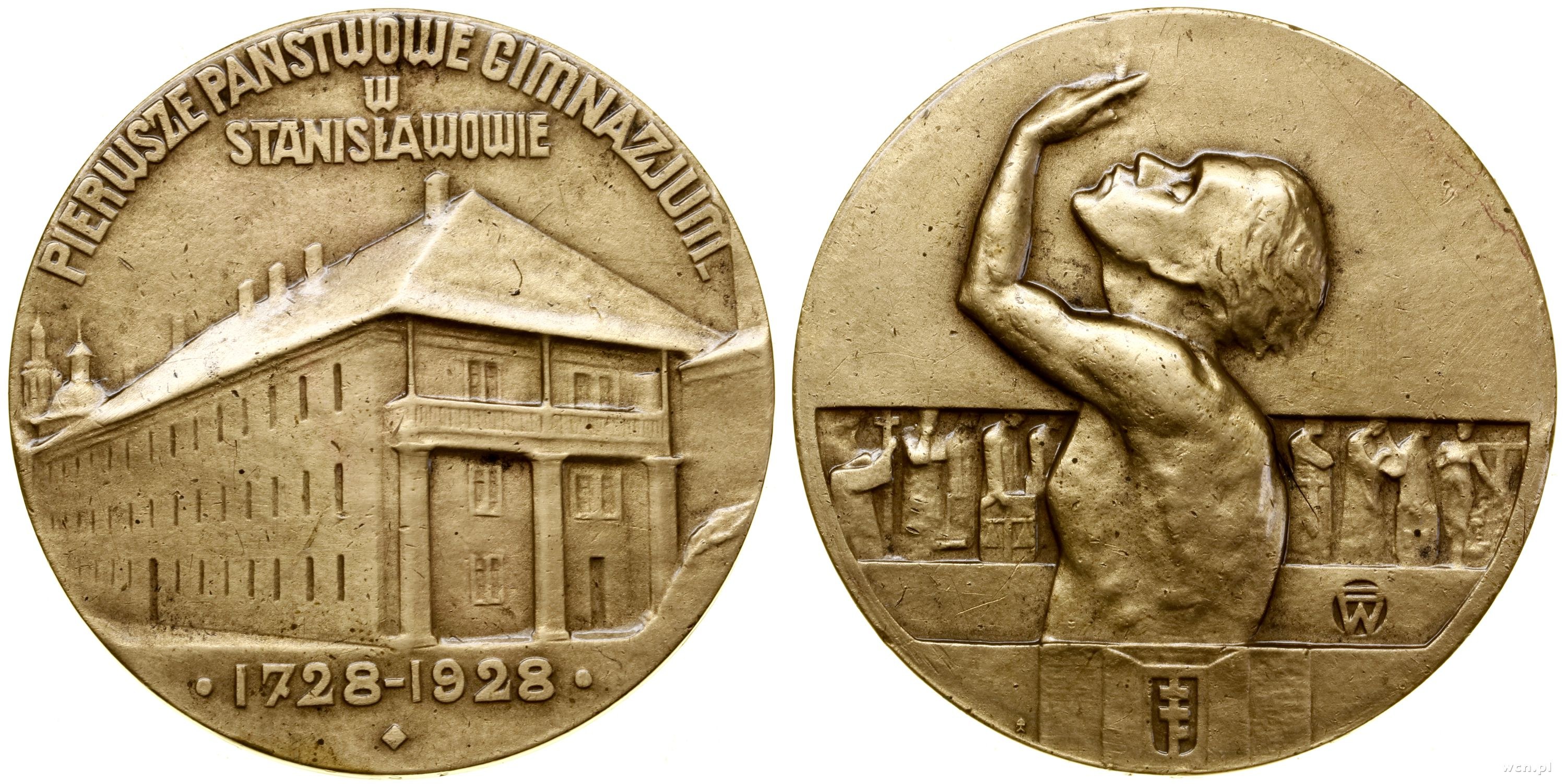 Aw: Widok budynku szkoły, PIERWSZE PAŃSTWOWE GIMNAZJUM / W / STANISŁAWOWIE, na dole • 1728–1928 •, Rw: Młodzieniec patrzący w górę, z uniesioną ręką, w tle pochód postaci, na dole herb Pilawa, Obrzeże: Nabity numer 1 68, projektował WOjciech Przedwojewski