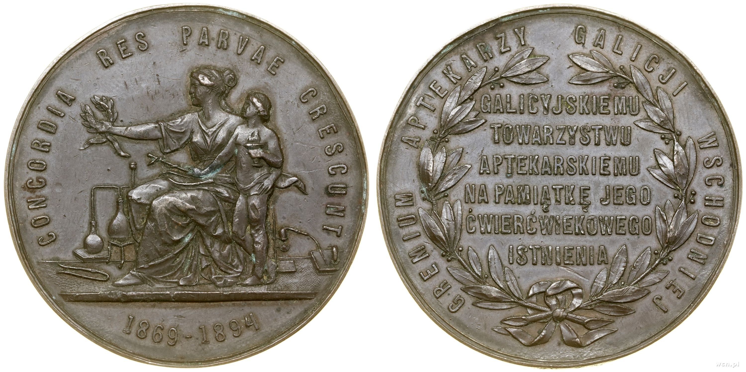 Aw: Concordia siedząca w lewo, Obok niej dziecko z kagankiem, wokół naczynia alchemiczne, CONCORDIA RES PARVAE CRESCUNT, w odcinku 1869-1894, Rw: Wieniec, w którym GALICYJSKIEMU / TOWARZYSTWU / APTEKARSKIEMU / NA PAMIĄTKĘ JEGO / ĆWIERĆWIEKOWEGO / ISTNIENIA, GREMIUM APTEKARZY GALICJI WSCHODNIEJ