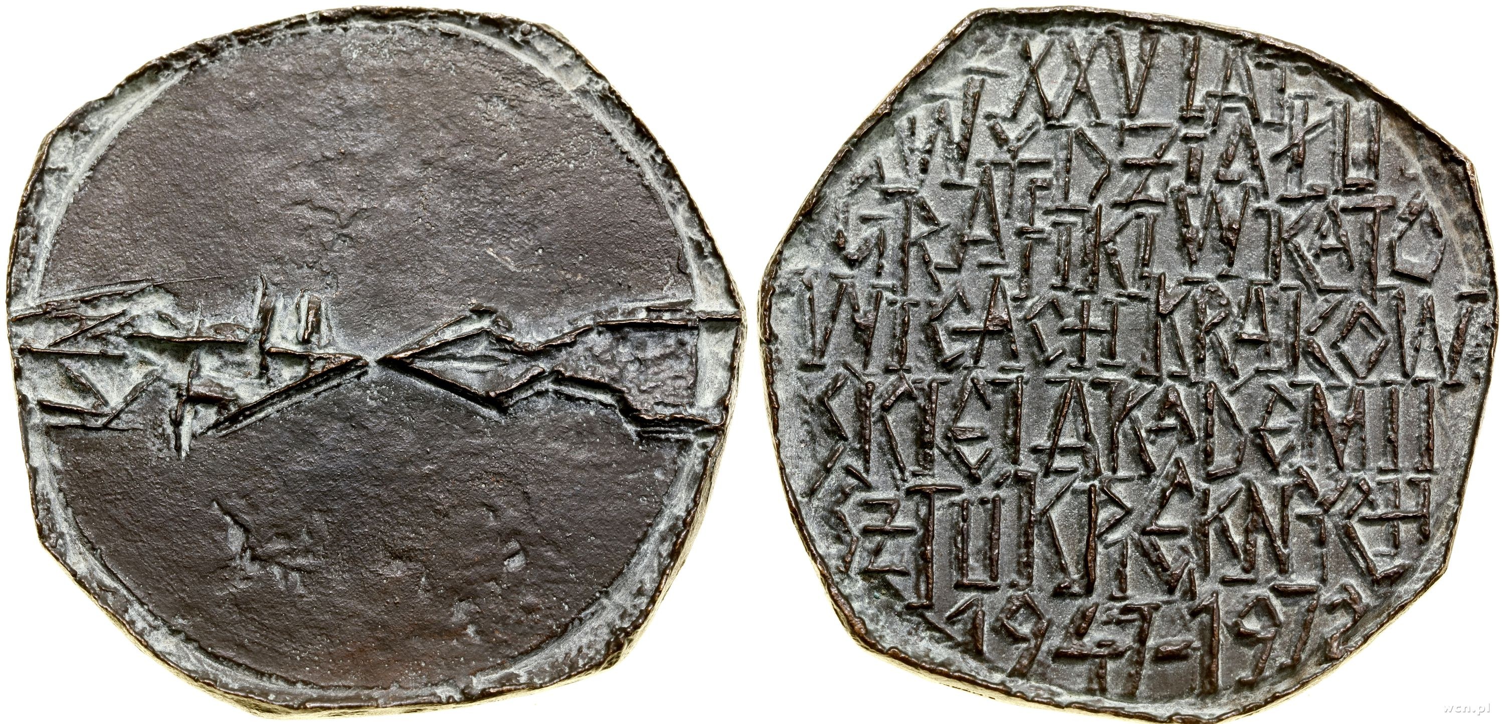 Aw: Schematyczna stalówka pióra, Rw: XXV LAT / WYDZIAŁU / GRAFIKI W KATO / WICHACH KRAKOW / SKIEJ AKADEMII / SZTUK PIĘKNYCH / 1947-1772; Obrzeże: Punca B.CHROMY, projektował Bronisław Chromy