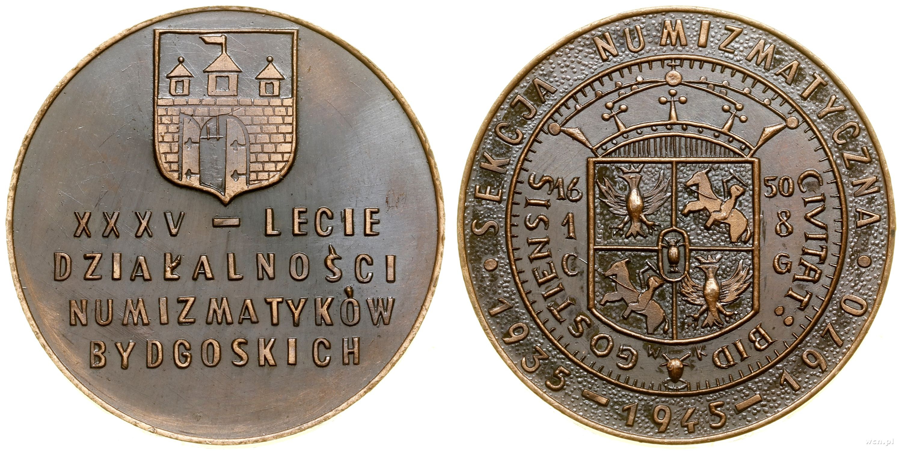 Aw: Herb Bydgoszczy, niżej XXXV - LECIE / DZIAŁALNOŚCI / NUMIZMATYKÓW / BYDGOSKICH, Rw: Stylizowany rewers orta bydgoskiego z 1650 roku, SEKCJA NUMIZMATYCZNA - 1935 - 1945 - 1970, Obrzeże: Punca srebra