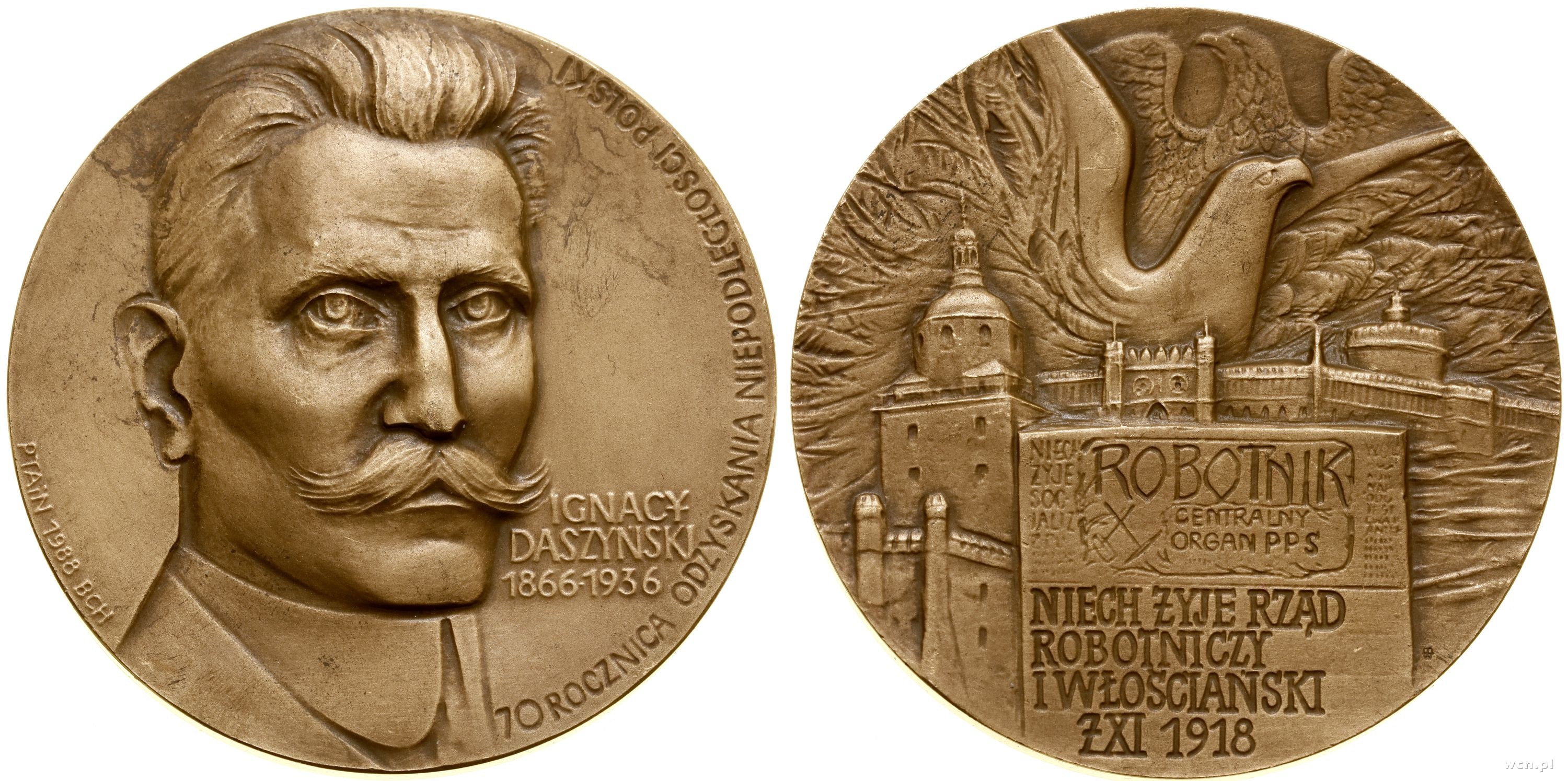 Aw: Popiersie Ignaczego Daszyńskiego 1/4 w prawo, z prawej IGNACY / DASZYŃSKI / 1866-1936, PTAiN 1988 BCH - 70 ROCZNICA ODZYSKANIA NIEPODLEGŁOŚCI POLSKI, Rw: Widok bramy krakowskiej i Zamku w Lublinie, wyżej Gołębica i Orzeł, z przodu pierwsza strona gazety Robotnik, na której NIECH ŻYJE RZĄD / ROBOTNICZY / I WŁOŚCIAŃSKI / 7XI 1918, medal projektu Bohdana Chmielewskiego
