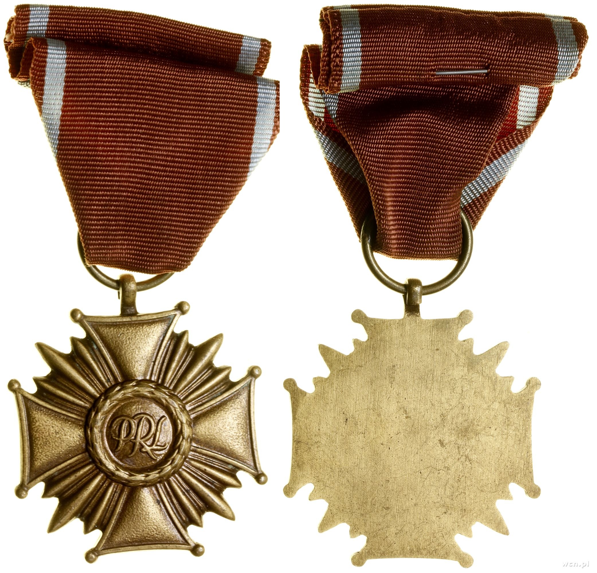 Krzyż kawalerski, z rogami ramion zakończonymi kulkami, w każdym kącie po pięć promieni, w medalionie w obwódce litery PRL