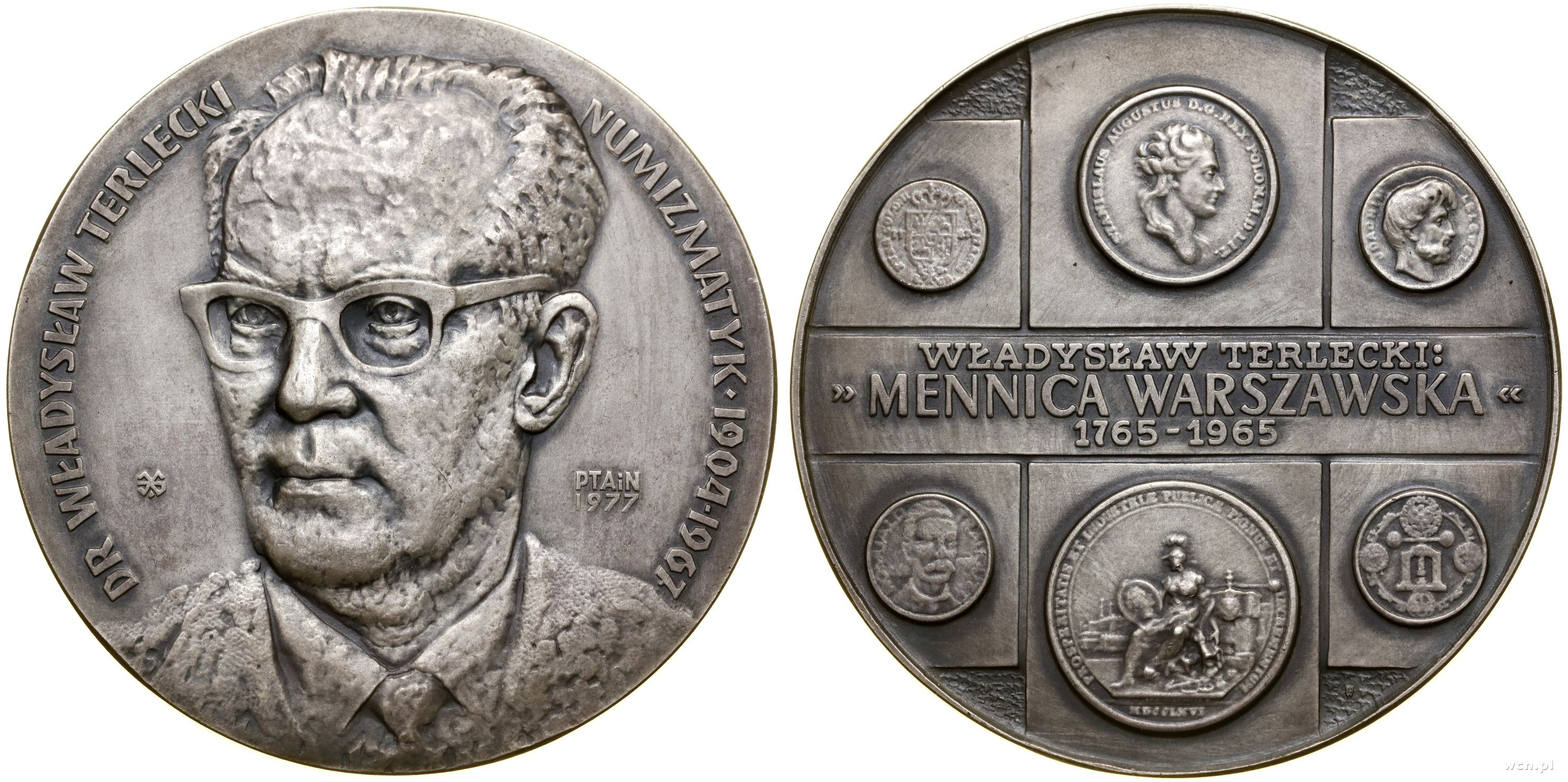 Aw: Popiersie 3/4 w lewo, z prawej PTAiN / 1977, DR WŁADYSŁAW TERLECKI - NUMIZMATYK • 1904-1967, Rw: WŁADYSŁAW TERLECKI / MENNICA WARSZAWSKA / 1765-1965, u góry i dołu przedstawienia monet i medali, Obrzeże: Nabite Ag, projektował Edward Gorol