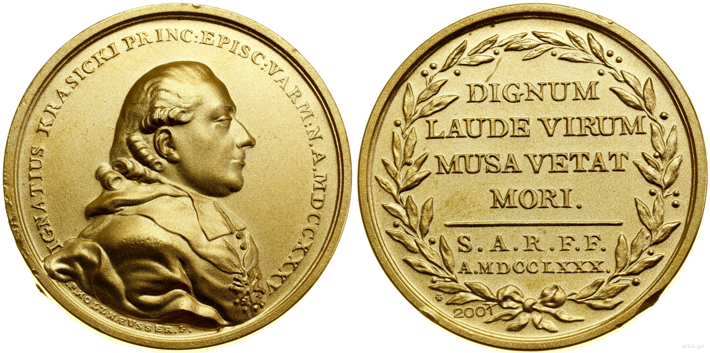Aw: Popiersie Krasickiego w biskupiej szacie w prawo, na dole sygnatura . P . HOLZHÆUSSER . F ., IGNATIUS KRASICKI PRINC : EPISC : VARM : N . A . MDCCXXXV; Rw: W wieńcu laurowym napis DIGNUM / LAUDE VIRUM / MUSA VETAT / MORI. (Muza chwaląc męża umierać mu nie daje), niżej S.A.R.F.F. / A. MDCCLXXX., na dole po lewej 2001, projektował Filip Holzhaeusser