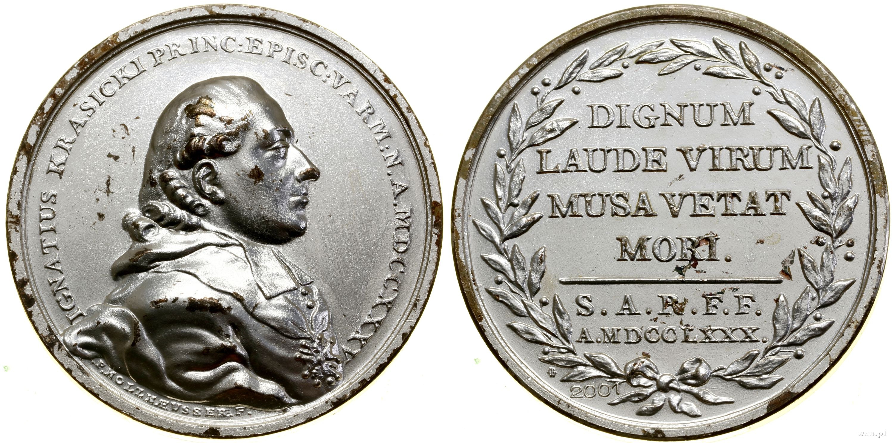 Aw: Popiersie Krasickiego w biskupiej szacie w prawo, na dole sygnatura . P . HOLZHÆUSSER . F ., IGNATIUS KRASICKI PRINC : EPISC : VARM : N . A . MDCCXXXV; Rw: W wieńcu laurowym napis DIGNUM / LAUDE VIRUM / MUSA VETAT / MORI. (Muza chwaląc męża umierać mu nie daje), niżej S.A.R.F.F. / A. MDCCLXXX., na dole po lewej 2001, projektował Filip Holzhaeusser