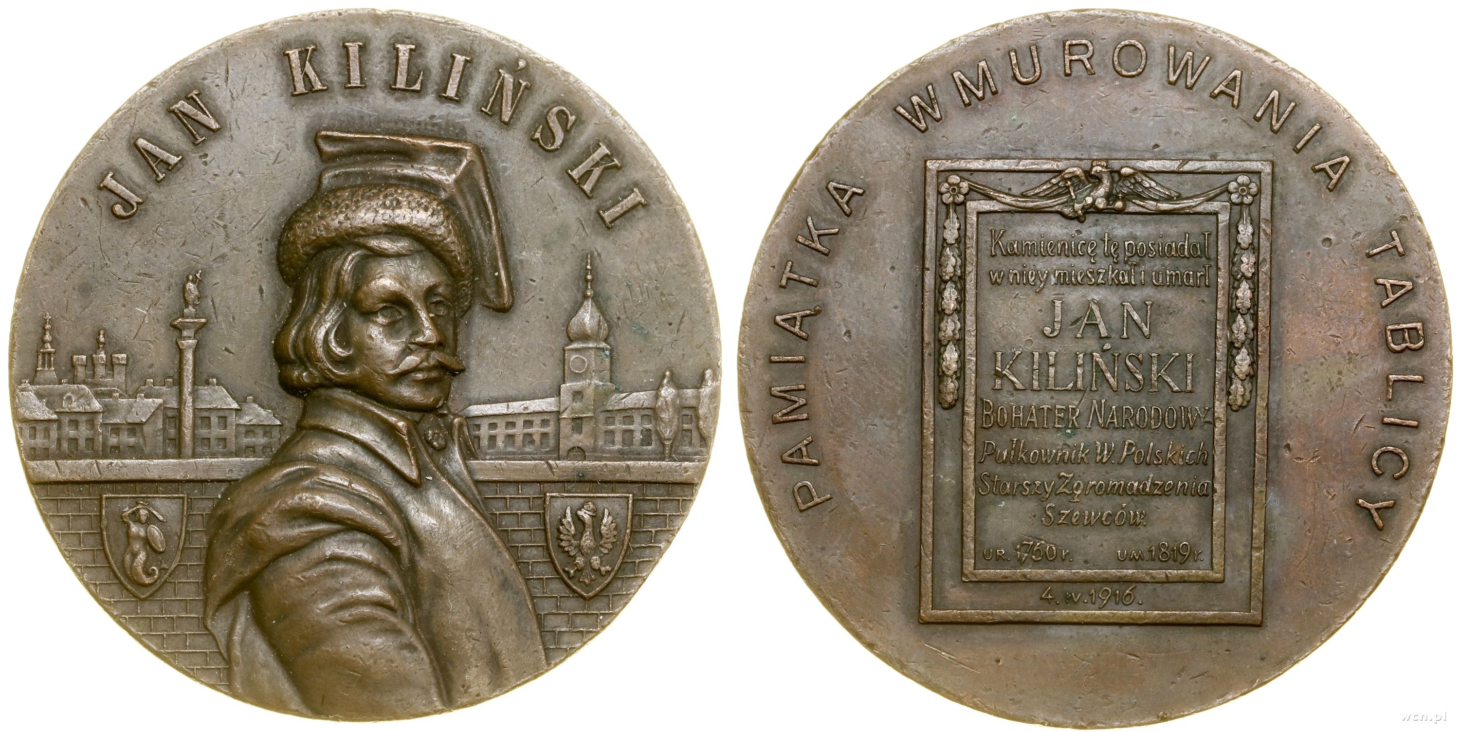 Aw: Półpostać w prawo, w tle mur, na którym tarcze z Syreną i Orłem, nad murem panorama Warszawy, JAN KILIŃSKI, Rw: Plakieta, na której Kamienicę tę posiadał / w niej mieszkał i umarł / JAN / KILIŃSKI / BOHATER NARODOWY / Pułkownik W. Polskich / Starszy Zgromadzenia / Szewców. / UR. 1760 r. - UM. 1819 r. / 4.IV.1916., PAMIĄTKA WMUROWANIA TABLICY, projektował W. Przedwojewski