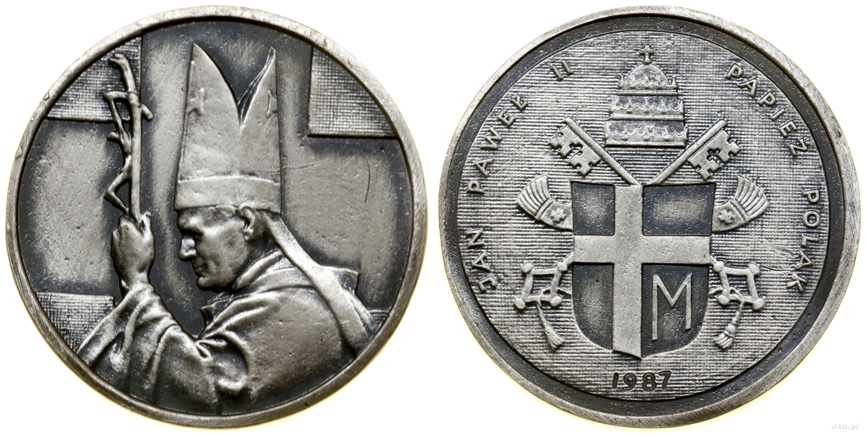 Aw: Półpostać papieża w lewo, na tle LUSTRZANEGO krzyża, Rw: Herb papieski, JAN PAWEŁ II - PAPIEŻ POLAK - 1987, projektowała Ewa Olszewska-Borys