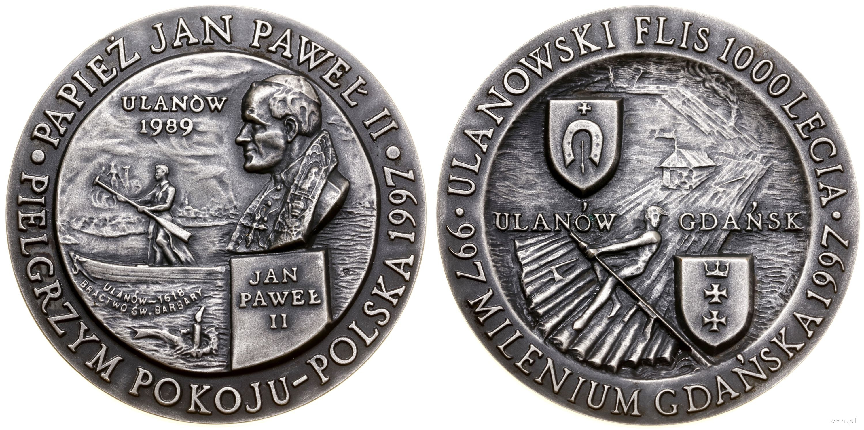 Aw: Popiersie papieża w lewo, na cokole, na którym napis JAN / PAWEŁ / II, w tle flisak na łodzi i panorama miasta, u góry ULANÓW / 1989, pod łodzią ULANÓW–1618 / BRACTWO Św. BARBARY, PAPIEŻ JAN PAWEŁ II - PIELGRZYM POKOJU–POLSKA 1997, Rw: Tratwa na rzecze, z flisakiem, z boków herby i ULANÓW - GDAŃSK, ULANOWSKI FLIS 1000 LECIA - 997 MILENIUM GDAŃSKA 1997, projektował Andrzej Pityński