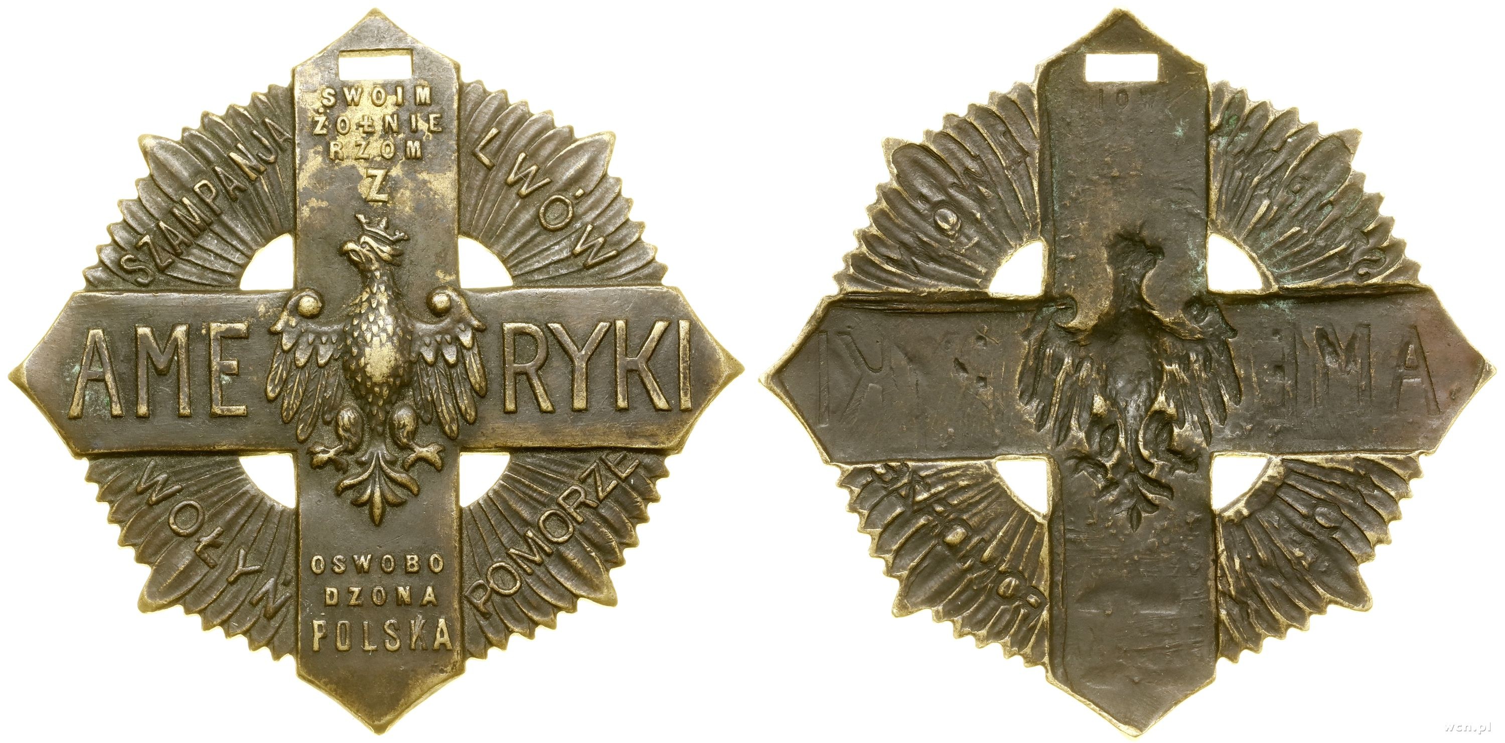 Krzyż równoramienny, w ramionach SWOIM / ŻOŁNIE / RZOM / Z - AME - RYKI - OSWOBO / DZONA / POLSKA, na środku krzyża Orzeł, w kątach promienie na których LWÓW - POMORZE - WOŁYŃ - SZAMPANJA, odznaka jednoczęściowa