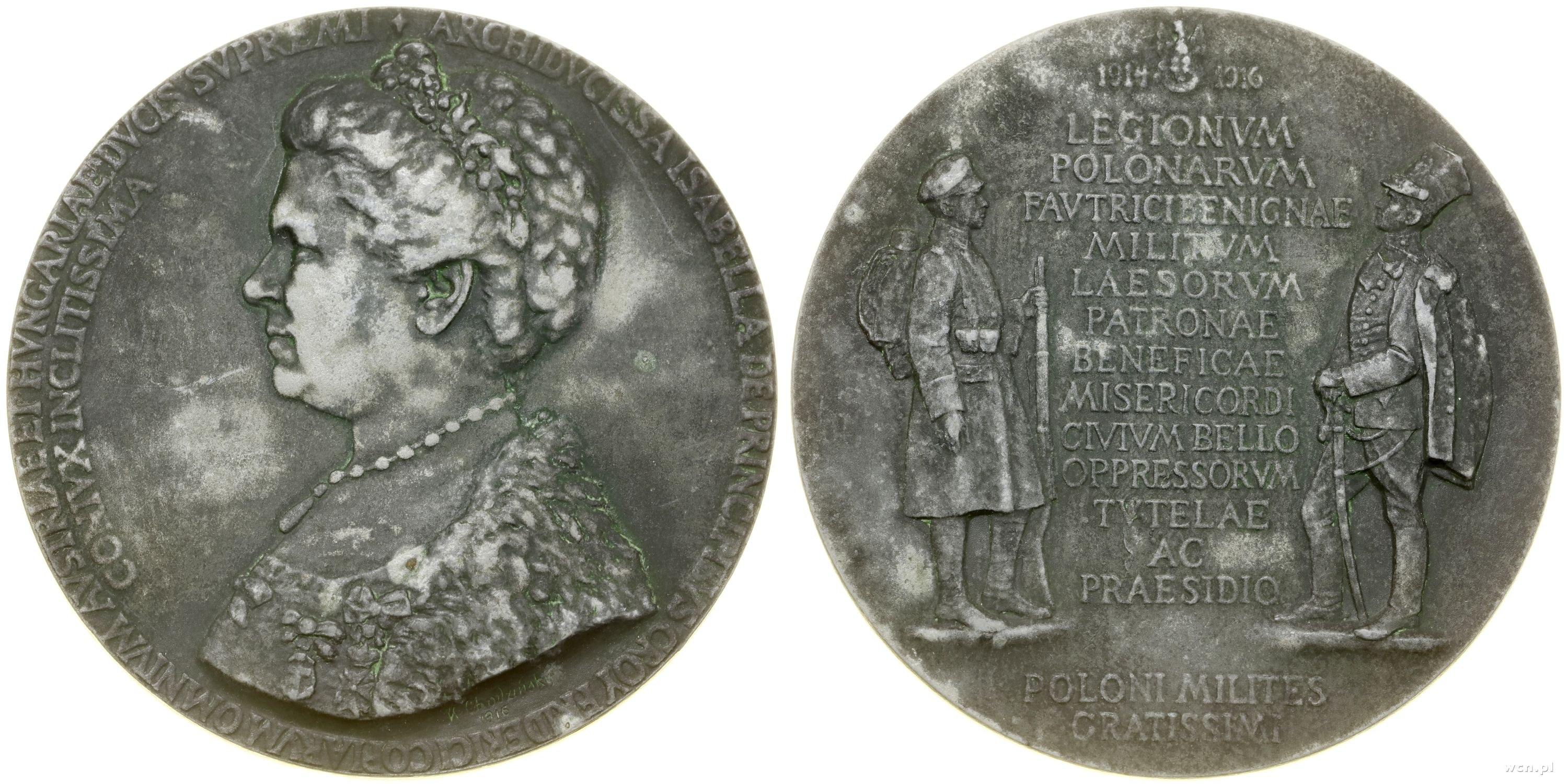 Aw: Popiersie Izabeli w lewo, na odcięciu ramienia sygnatura K.Chodziński / 1916, ARCHIDVCISSA ISABELLA DE PRINCIPIBVS CROY FRIDERICI COPIARVM OMNIVM AUSTRIAE ET HVNGARIAE DVCIS SVPREMI / CONIVX INCLITISSIMA, Rw: Dwóch legionistów zwróconych do siebie, między nimi mały orzełek i daty 1914 - 1916, niżej napis LEGIONVM / POLONIARVM / FAVTRICI BENIGNAE / MILITVM / LAESORVM / PATRONAE / BENEFICAE / MISERICORDI / CIVIVM BELLO / OPPRESSORVM / TVTELAE / AC / PRAESIDIO / POLONI MILITES / GRATISSIMI, projektował Kazimierz Chodziński