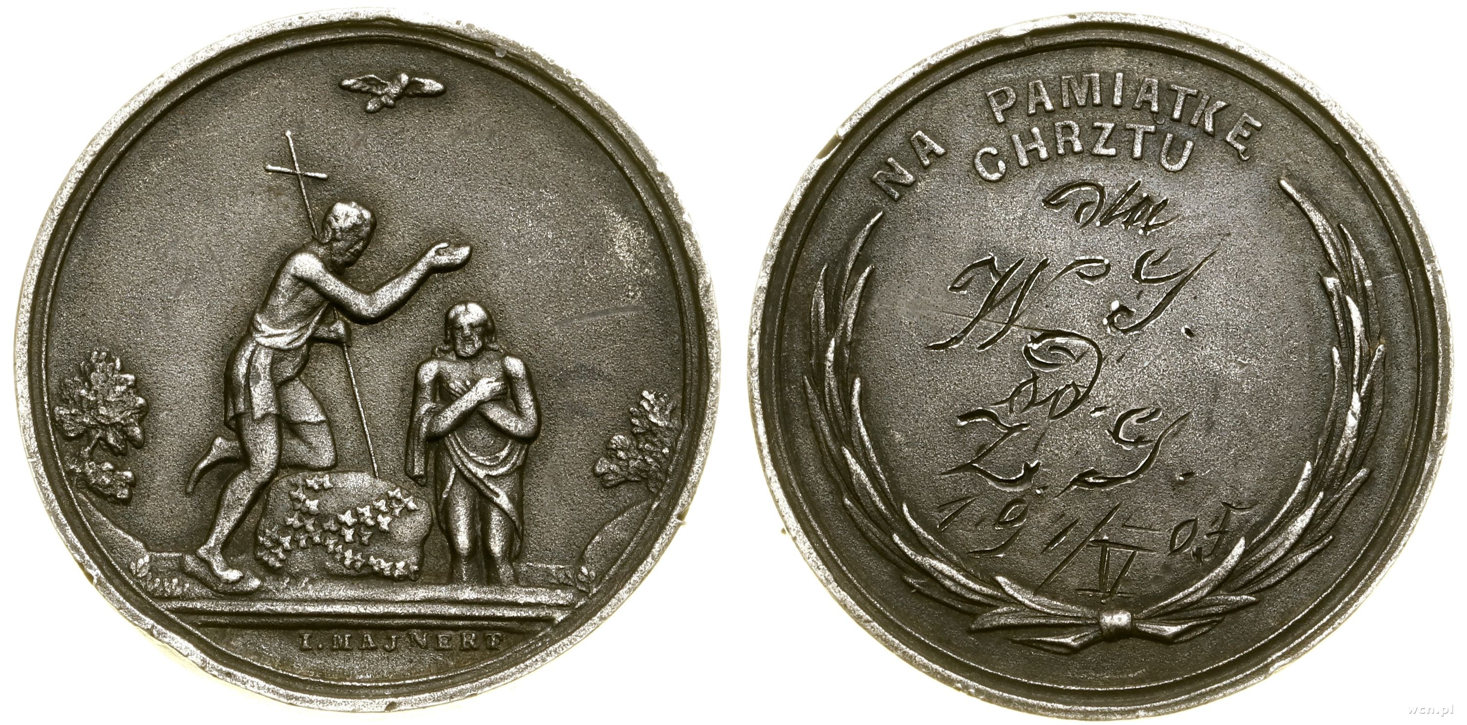 Aw: Święty Jan klęczący na skale udzielający chrztu stojącemu w wodzie Jezusowi, nad nimi Gołębica, znak Ducha Świetego, Rw: u góry w otoku napis NA PAMIĄTKĘ CHRZTU, poniżej wieniec, w środku dedykacja dla / W. J. / od / Z. J. / 19 I/V 05, Obrzeże: Dwie punce
