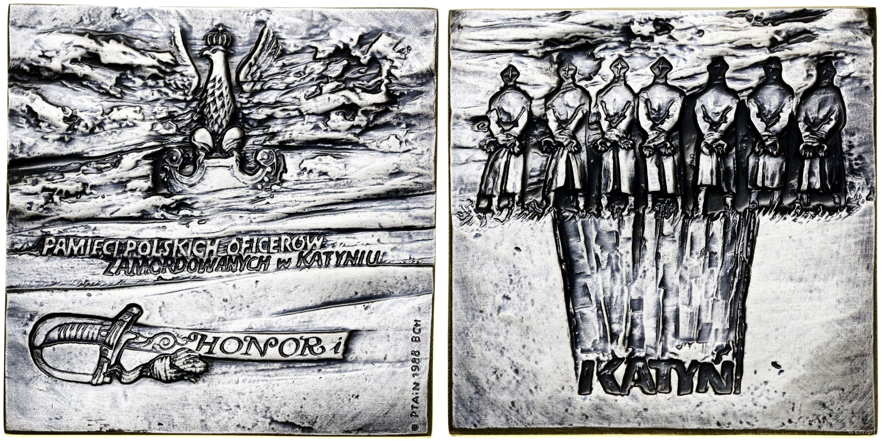 Aw: Orzeł wojskowy, niżej PAMIĘCI POLSKICH OFICERÓW / ZAMORDOWANYCH W KATYNIU, niżej ułamana szabla z napisem HONOR i, z prawej sygnatura mennicy i PTAiN 1988 BCH, Rw: Grupa ludzi ze związanymi rękami, stojących tyłem nad dziurą, na dnie której napis KATYŃ, projektował Bohdan Chmielewski