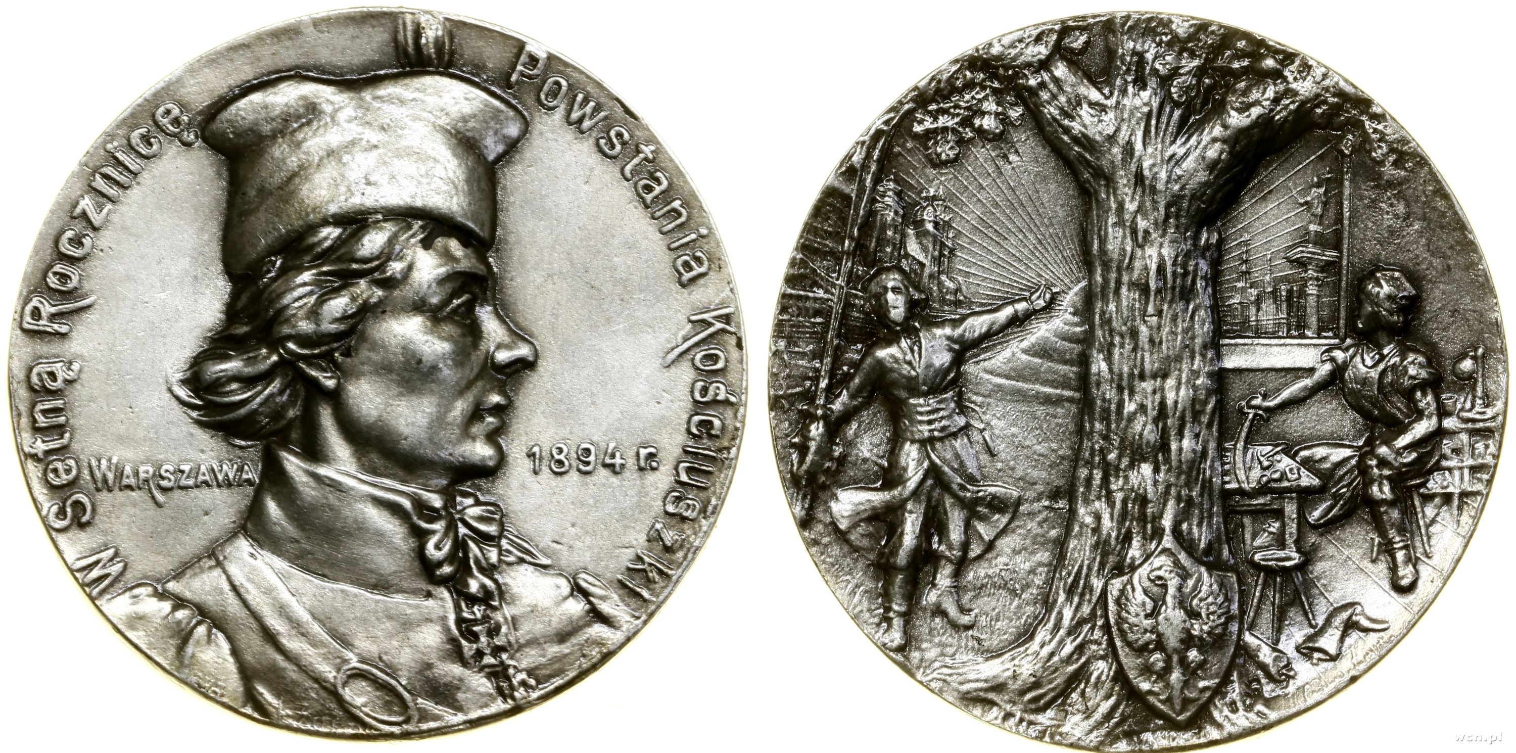 Aw: Popiersie Kościuszki w czamarze w prawo, z boku WARSZAWA - 1894 R., wokoło legenda W SETNĄ ROCZNICĘ POWSTANIA KOŚCIUSZKI, Rw: Dąb, na pniu tarcza z Orłem, z lewej stojący kosynier, z prawej szabelnik w warsztacie, w tle Zamek na Wawelu i kopiec Kościuszki nad którym wstaje słońce oraz Plac Zamkowy w Warszawie